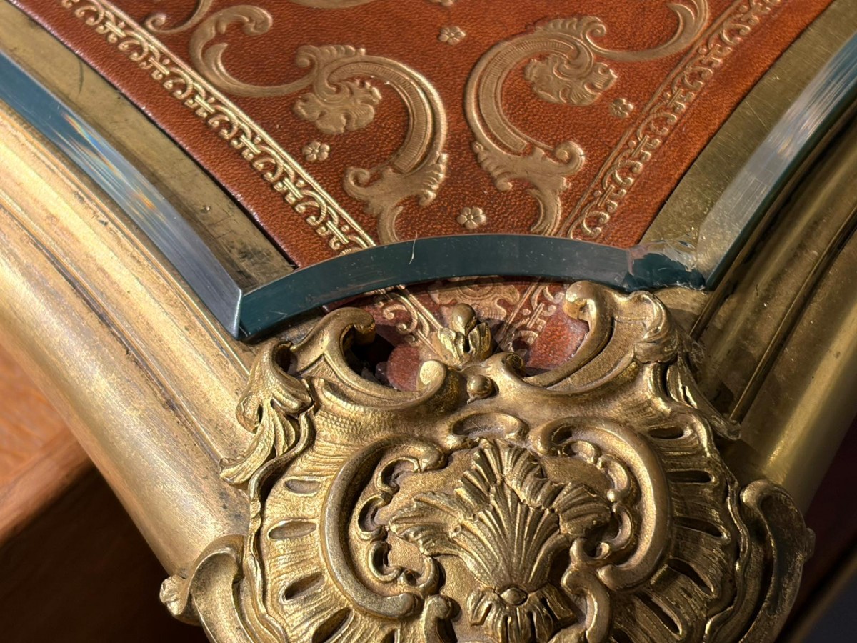 The piece is crafted from richly veneered wood, featuring a carefully composed marquetry pattern that creates a warm and vibrant surface. The gently shaped top follows the elegant contours of the base and is framed by a finely chiselled gilt-bronze border.