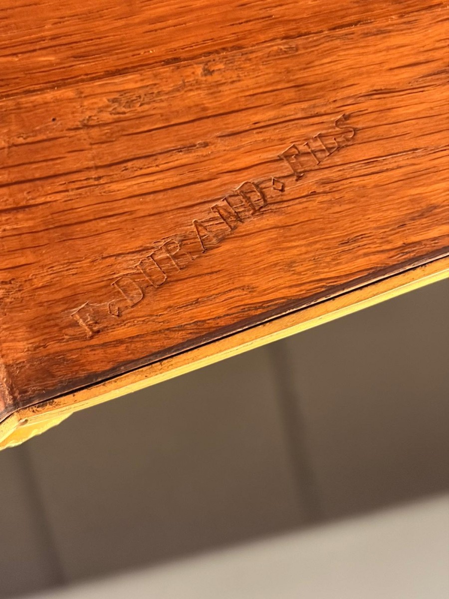 The desk is stamped “Durand & Fils” (multiple times), firmly identifying it as the work of Gervais-Maximilien-Eugène Durand (1839–1920), a leading Parisian cabinetmaker renowned for his high-quality interpretations of 18th-century furniture. His workshop gained international recognition and was awarded at the Paris Exposition Universelle of 1889, where his work was praised for its stylistic authenticity and technical excellence.