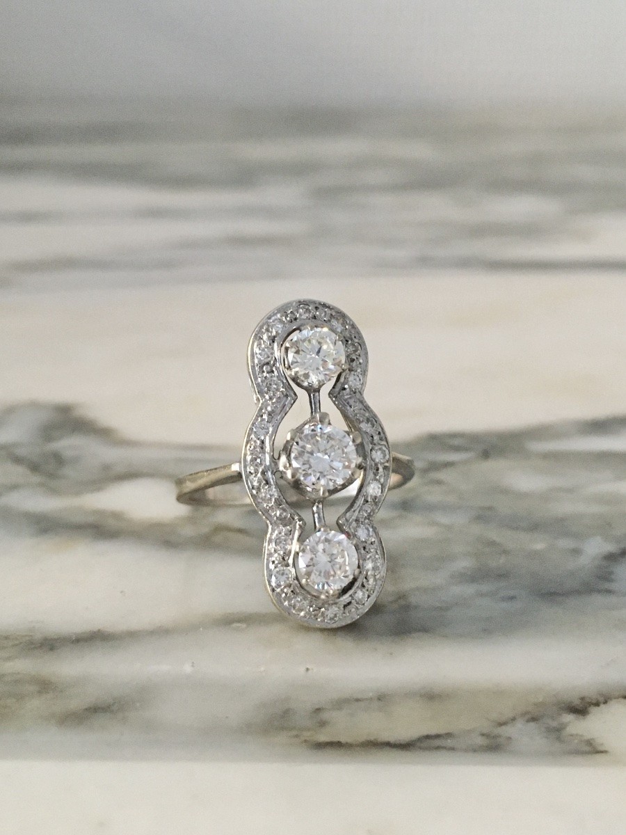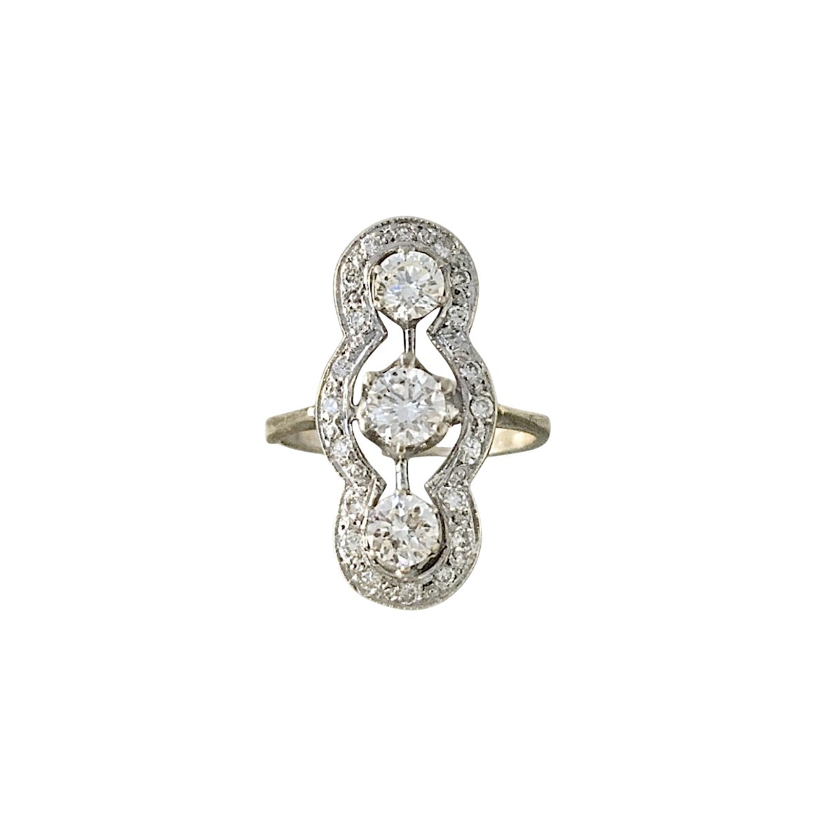Vintage 18K white gold ring composed of 3 central brilliant-cut natural diamonds.