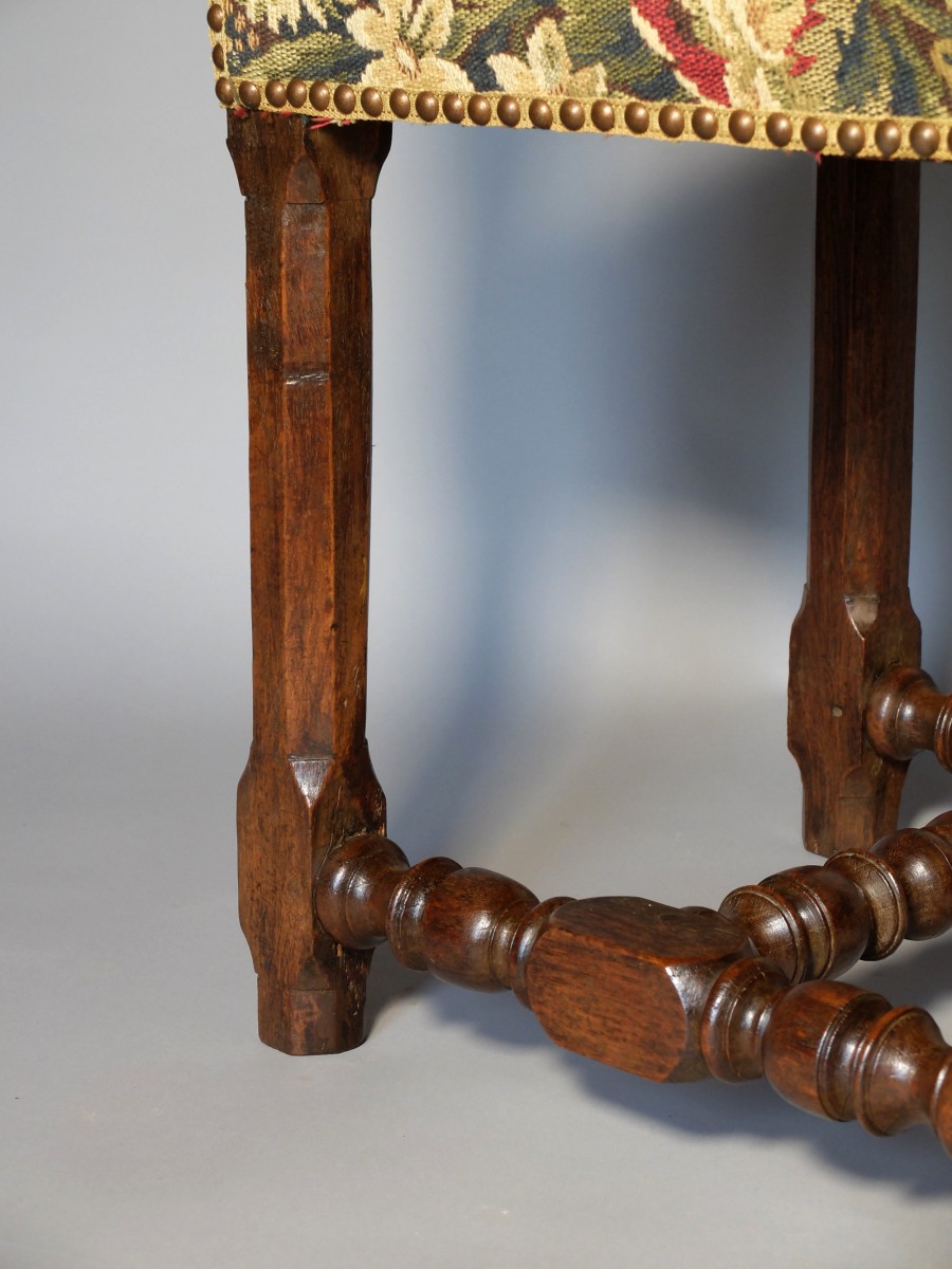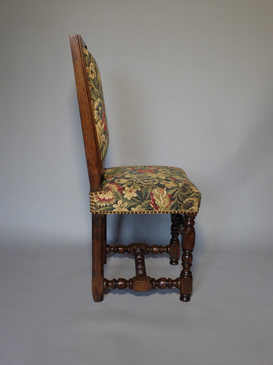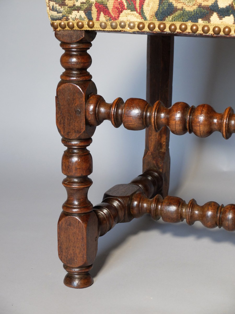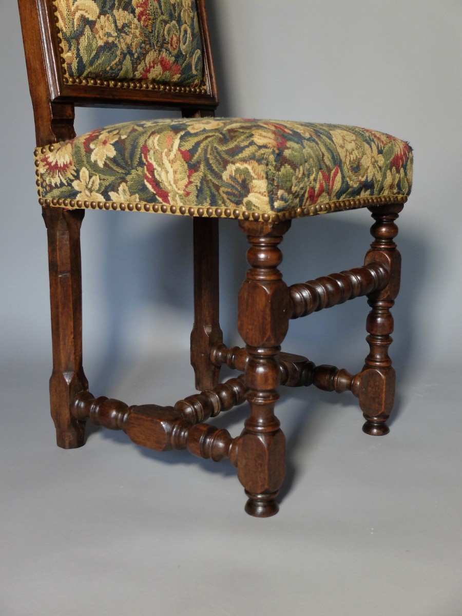 The square-section rear legs, chamfered at the corners, are joined to the front legs by a handsome turned H-brace.