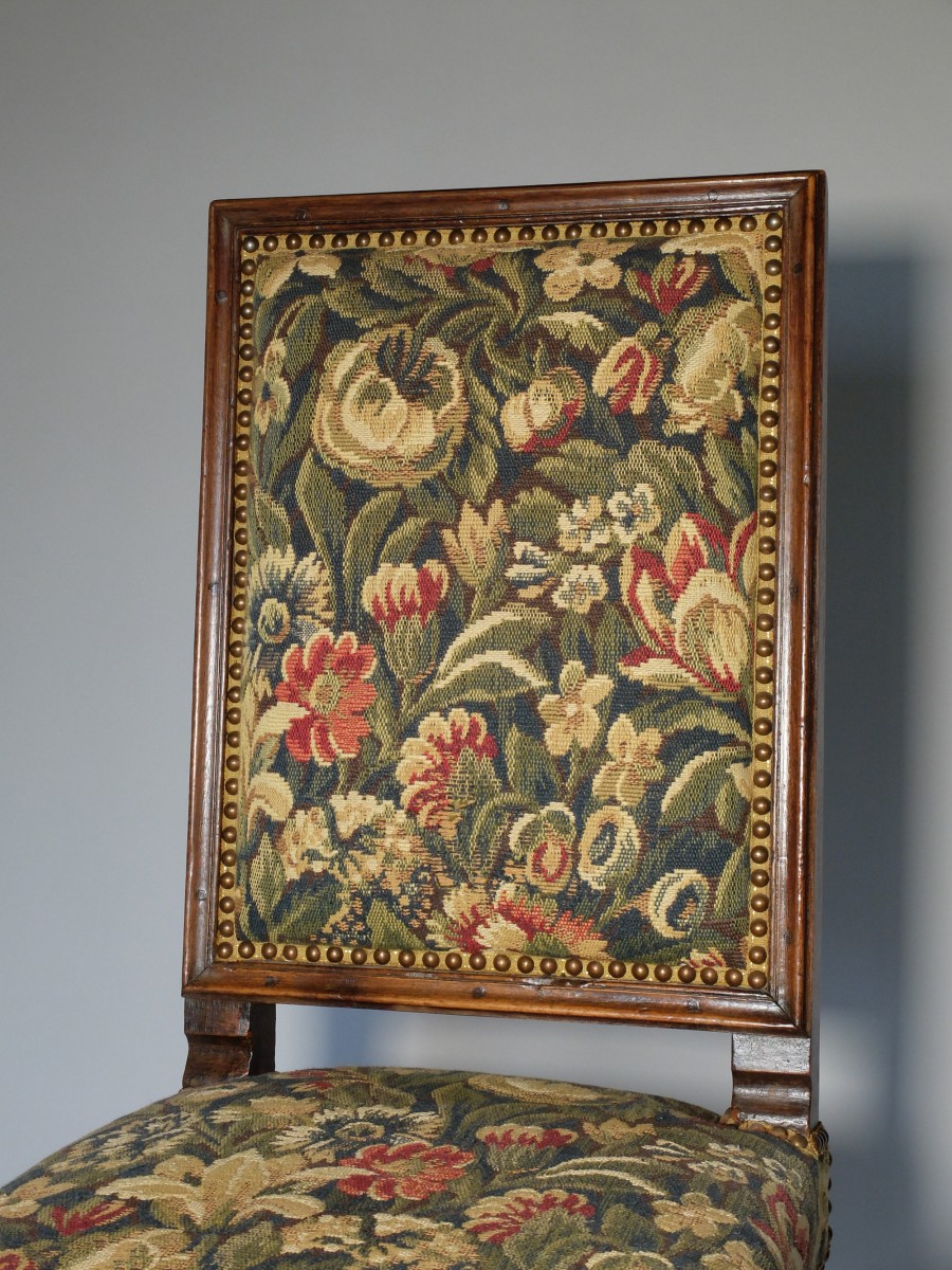 The backrest features a beautifully molded walnut frame. Beautiful fabric upholstery in the manner of Aubusson tapestries.