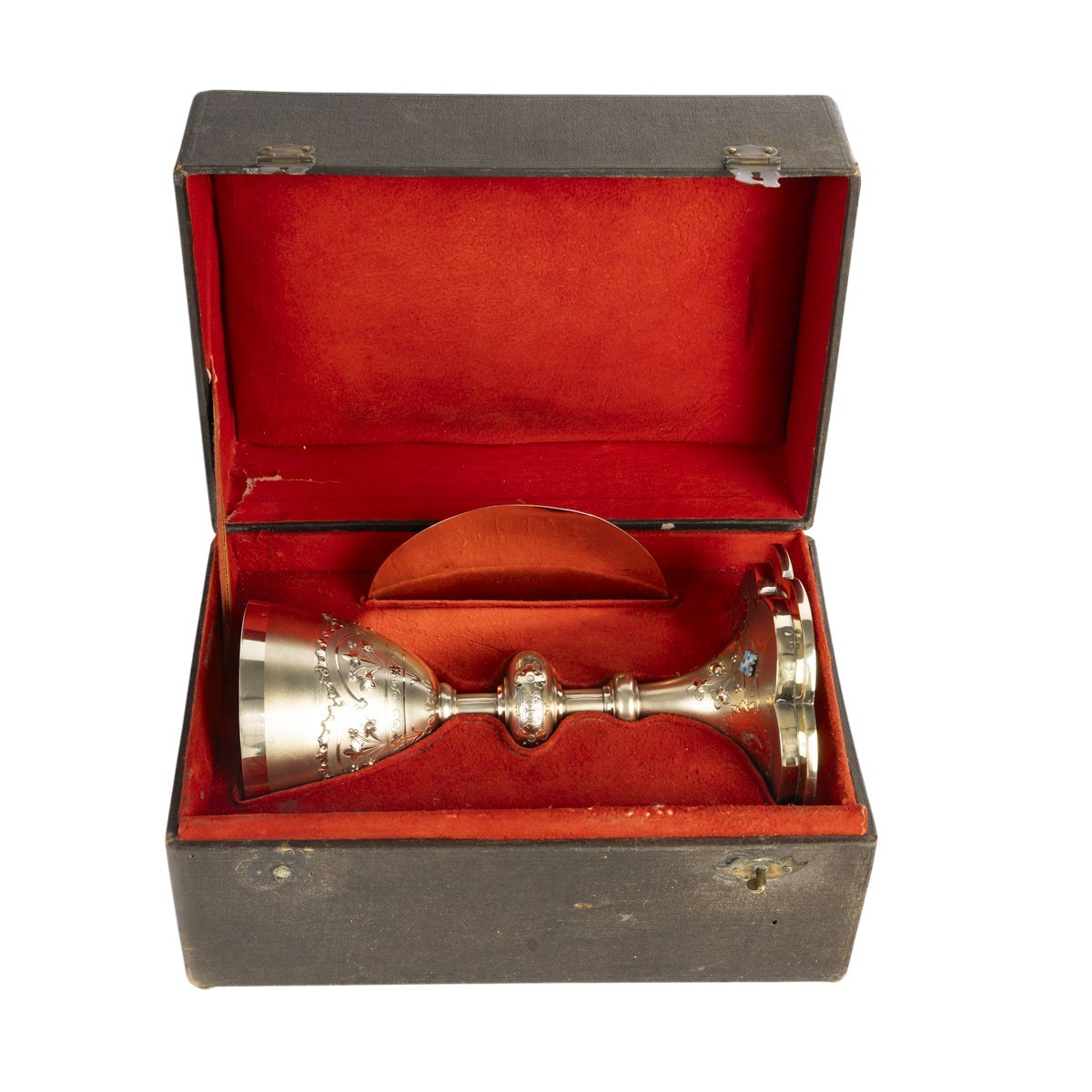 The chalice has a silver paten decorated with four petals forming a cross on the reverse.