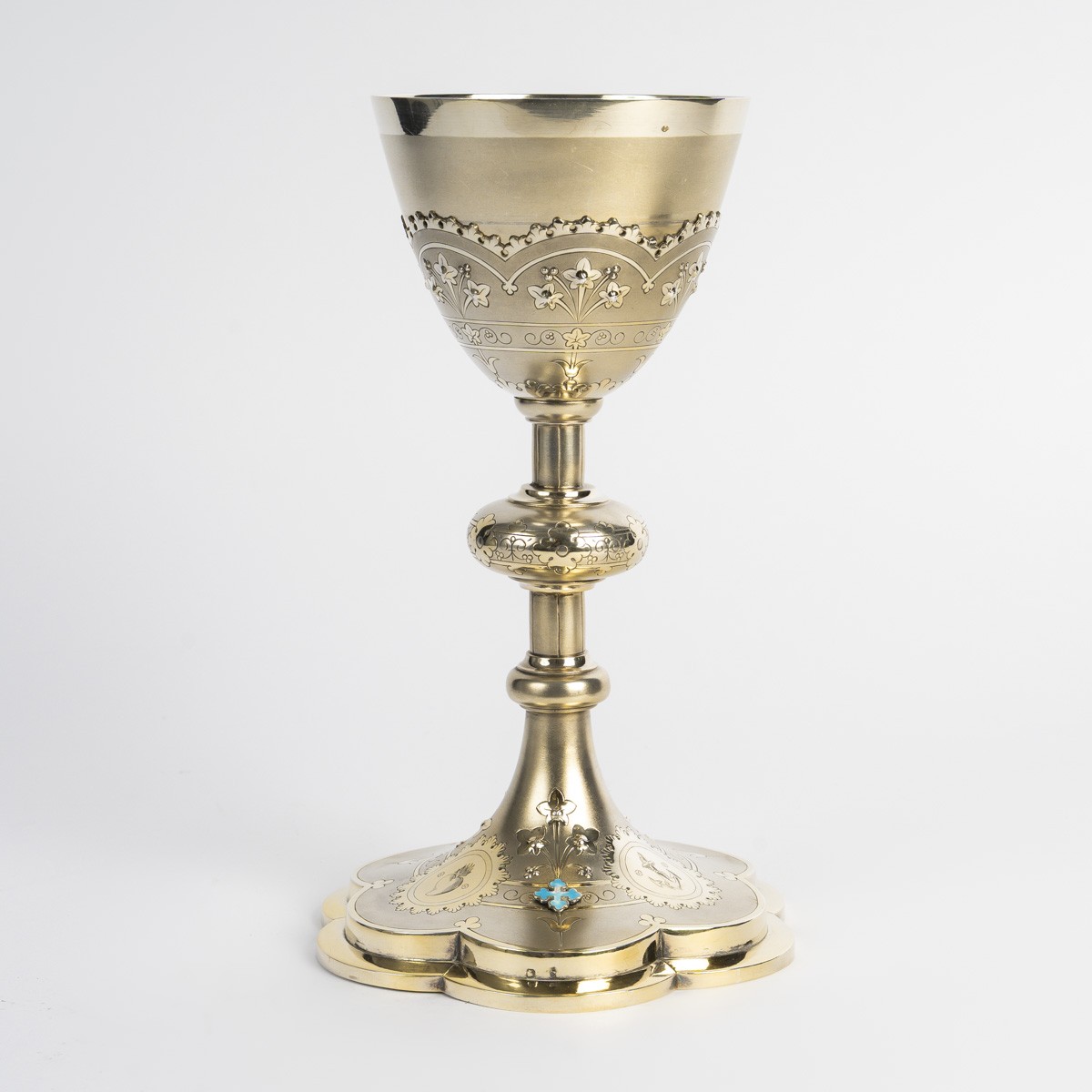 Polylobed base decorated with lithurgical symbols and adorned with a turquoise enameled cross.