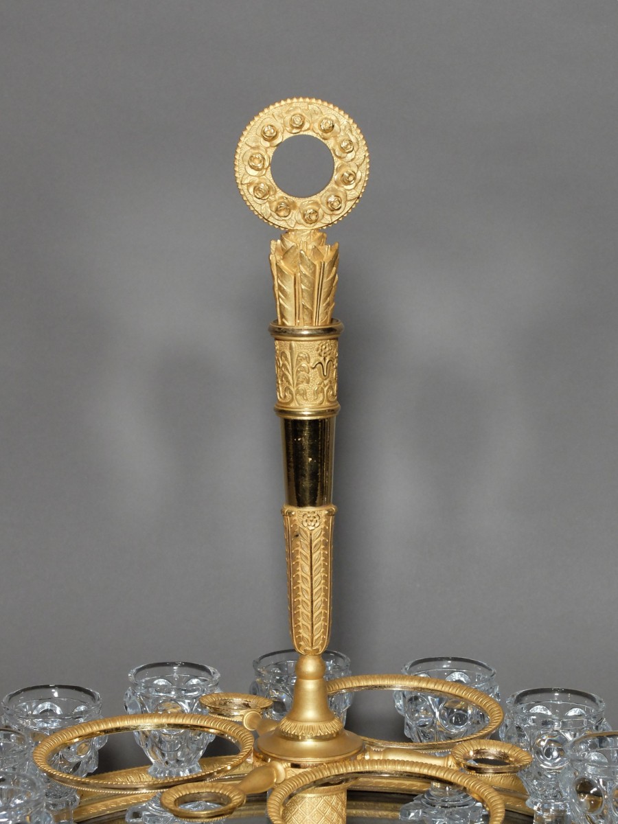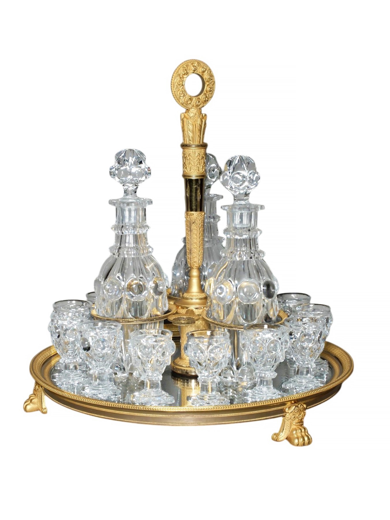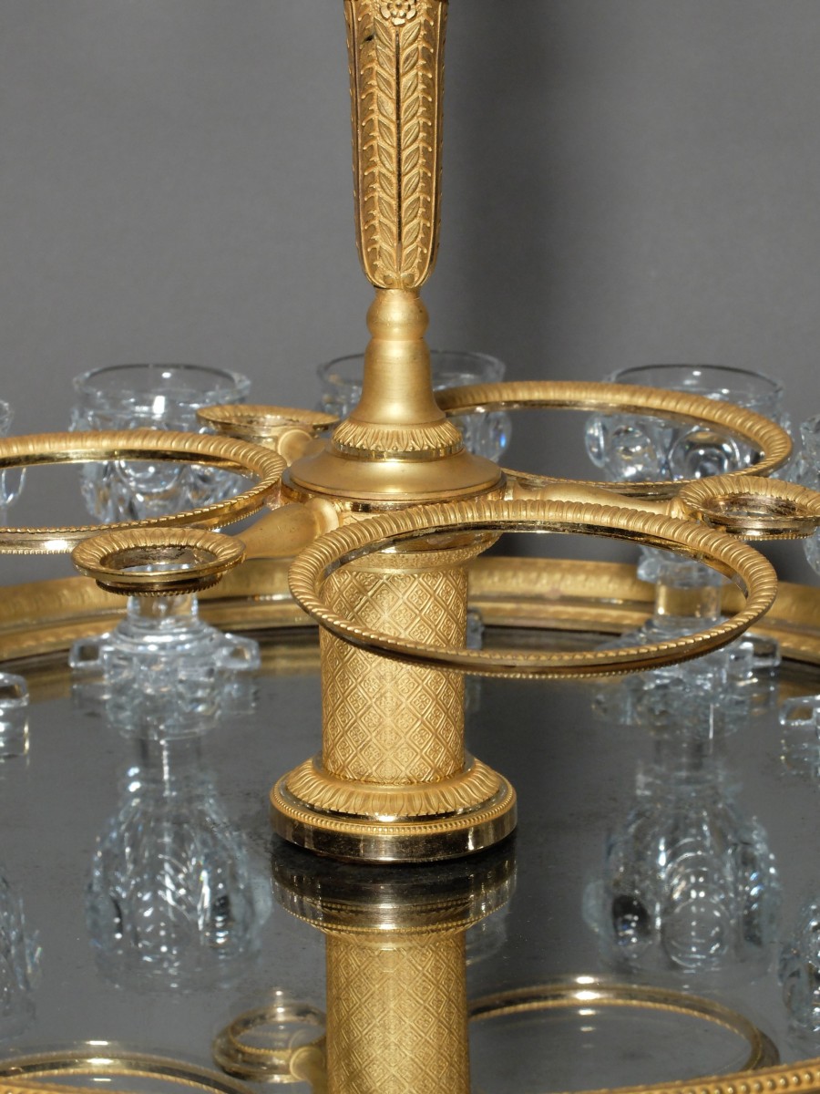 On a round tray, encircled by a gilded bronze with palm and pearl decoration, a mercury mirror holds 3 decanters and their stoppers, as well as 13 cut crystal glasses.