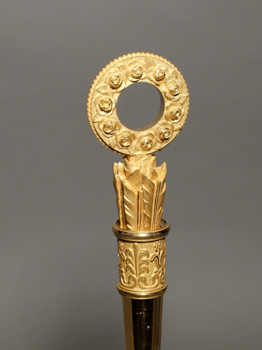 The central part accommodates the 3 decanters and their stoppers, and in the center, a quiver-shaped grip ends in a ring decorated with flowers.