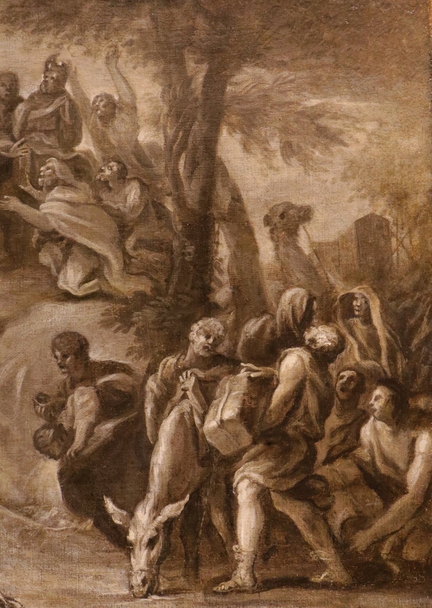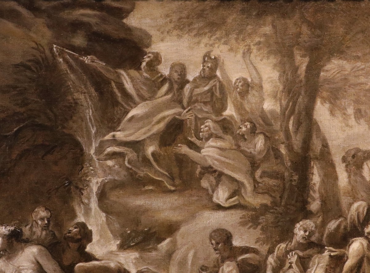 Cette toile fascinante, représentant l'épisode de l'Ancien Testament où Moïse fait jaillir l'eau du rocher, suit une structure descriptive qui nous amènerait à supposer qu'il s'agit d'une précieuse esquisse préparatoire, d'une étude pour un retable de plus grandes dimensions ou, plus probablement encore, pour une fresque.