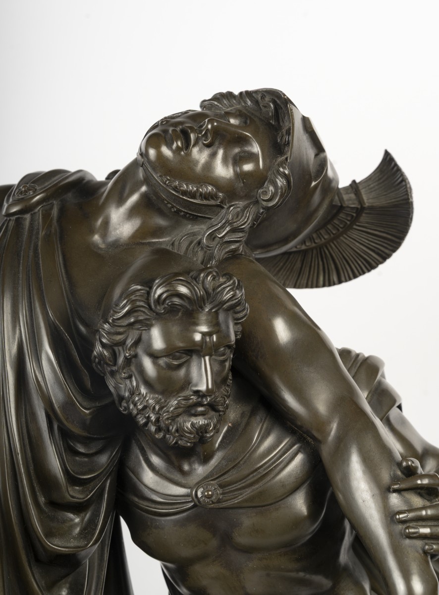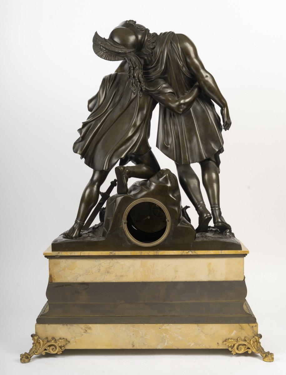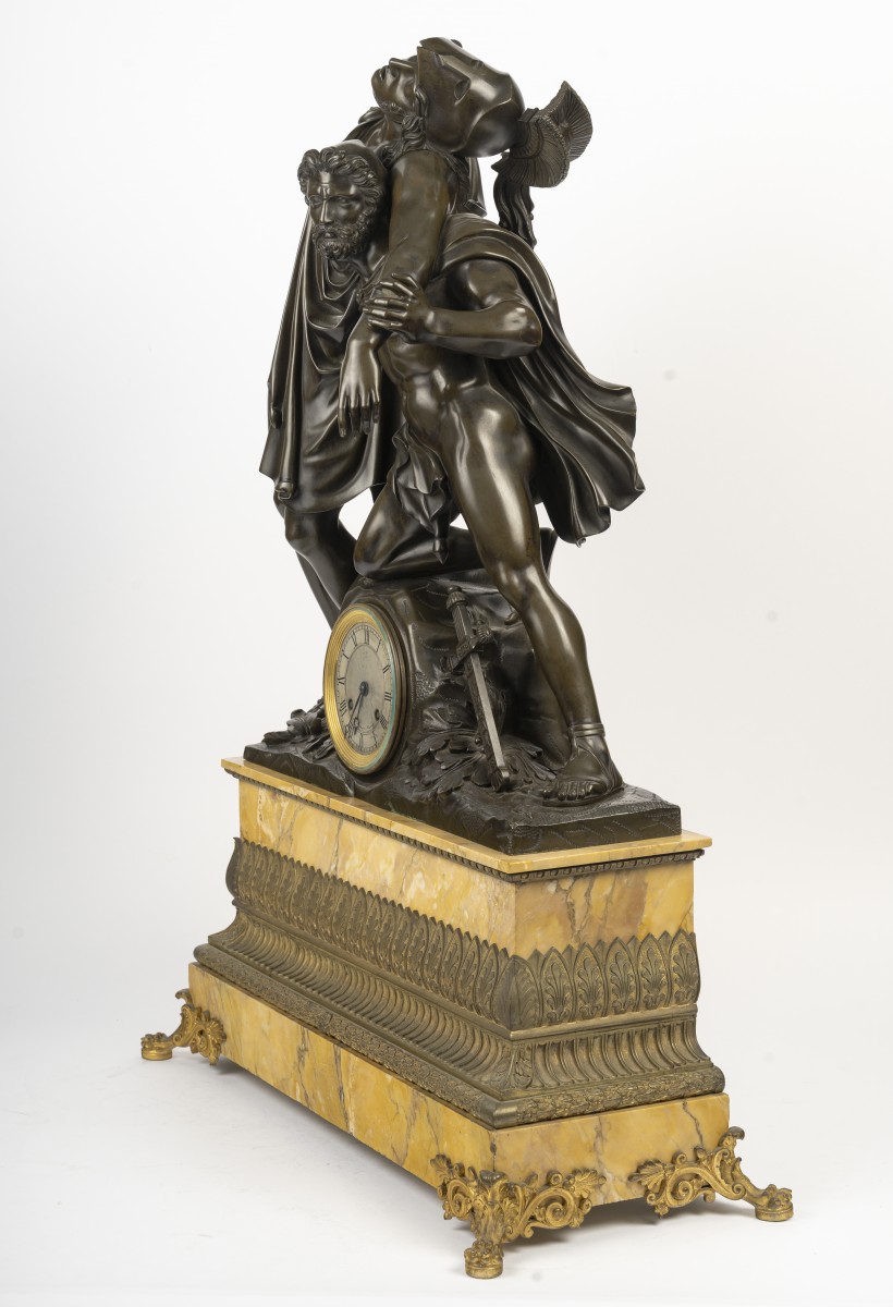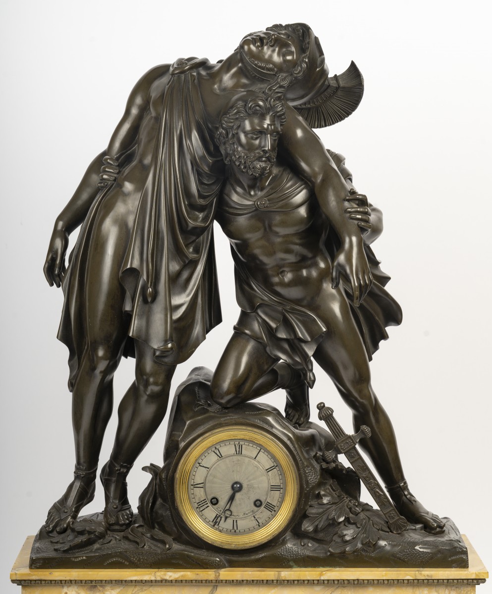 A very large clock depicting Achilles supported by Patroclus after the battle with Hector, capturing a moment of heroism and fraternity.