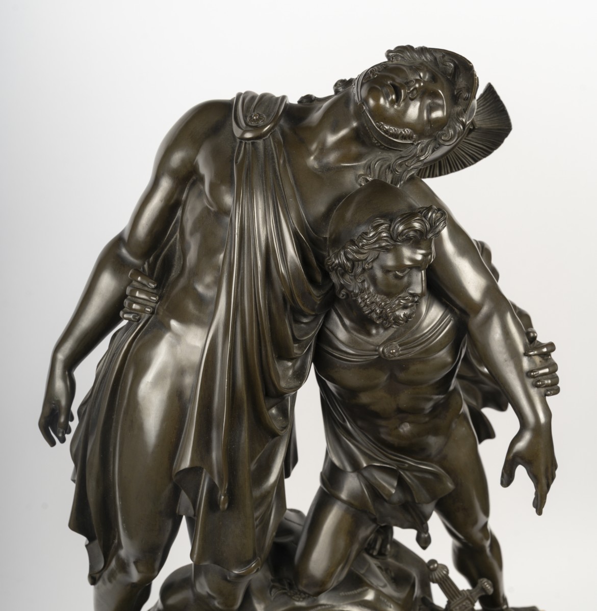 The two Greek heroes are shown in a highly realistic composition: Achilles, weakened after the battle, is supported by his friend and comrade-in-arms Patroclus. The tension of the muscles, the flow of the drapery, and the expressions on their faces convey fraternity and courage, central themes of early 19th-century Neoclassical sculpture. Every detail, from the folds of the clothing to the features of the heroes, demonstrates remarkable craftsmanship. The dark brown patina enhances the finesse of the bronze, giving the scene a strikingly lifelike quality and transforming this clock into a true work of art.