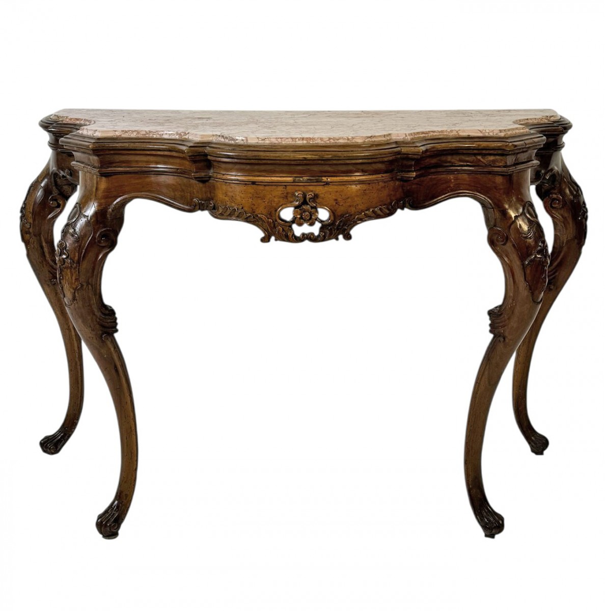 Walnut console, Veneto, 18th century, mixtilinear belt, with front carved with light rocaille motifs centering a floral motif, arched legs with attachment carved in a cartouche centered by a flower, curled feet, pink veined marble top, 77.5x113x56 cm