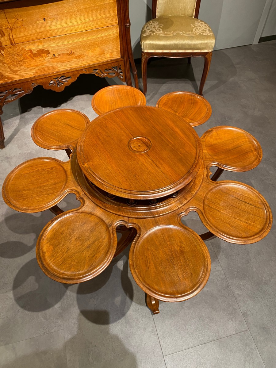 The circular top rests above an ingenious composition of eight smaller platforms arranged in a radiating circle. These peripheral trays, delicately integrated into an openwork gallery of turned spindles, create a harmonious visual rhythm while serving a convivial function—ideal for presenting and sharing tea with both practicality and refinement.