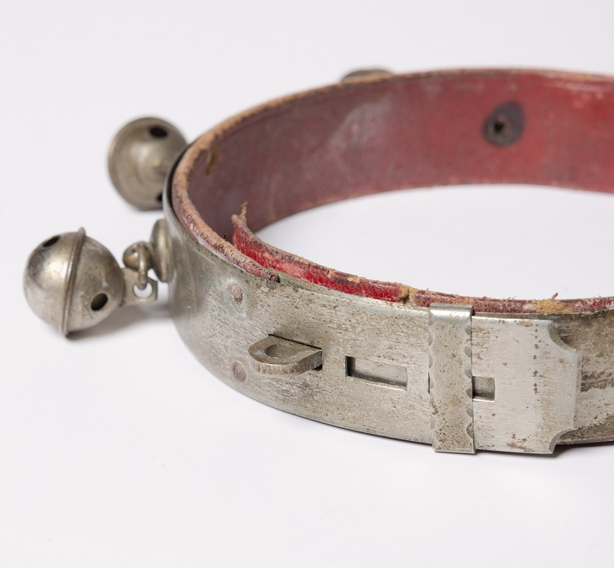 Two French silvered brass dog collars with red leather linings , one with three bells, both with the inscription: Baron Sellière, chateau de Mello, Oise.
