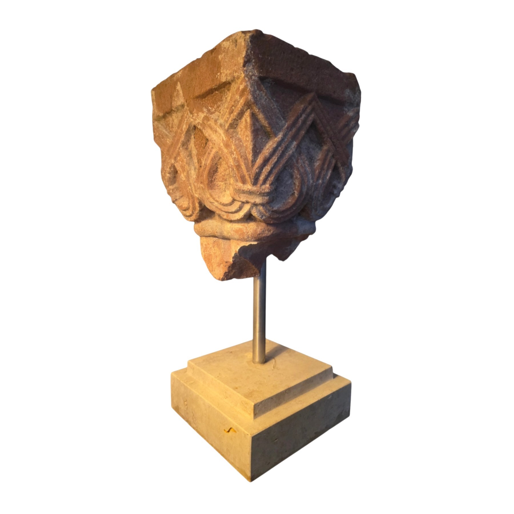 Small column capital in pink sandstone characteristic of the Main basin. Carved on all sides, it probably comes from a cloister or an arcade. The basket, an inverted truncated cone, flares out to meet an integrated rectangular abacus. The decoration is entirely governed by a composition of ribbon interlace of great geometric rigor. This capital stands out for its use of tripartite ribbons, each band divided by two longitudinal incisions creating three parallel cords. In the lower corners of the basket, the ribbons are joined by transverse bindings. This ornamental grammar, typical of Imperial art under the Hohenstaufen, points to the workshops of Würzburg in the second half of the 12th century, around 1150–1170.