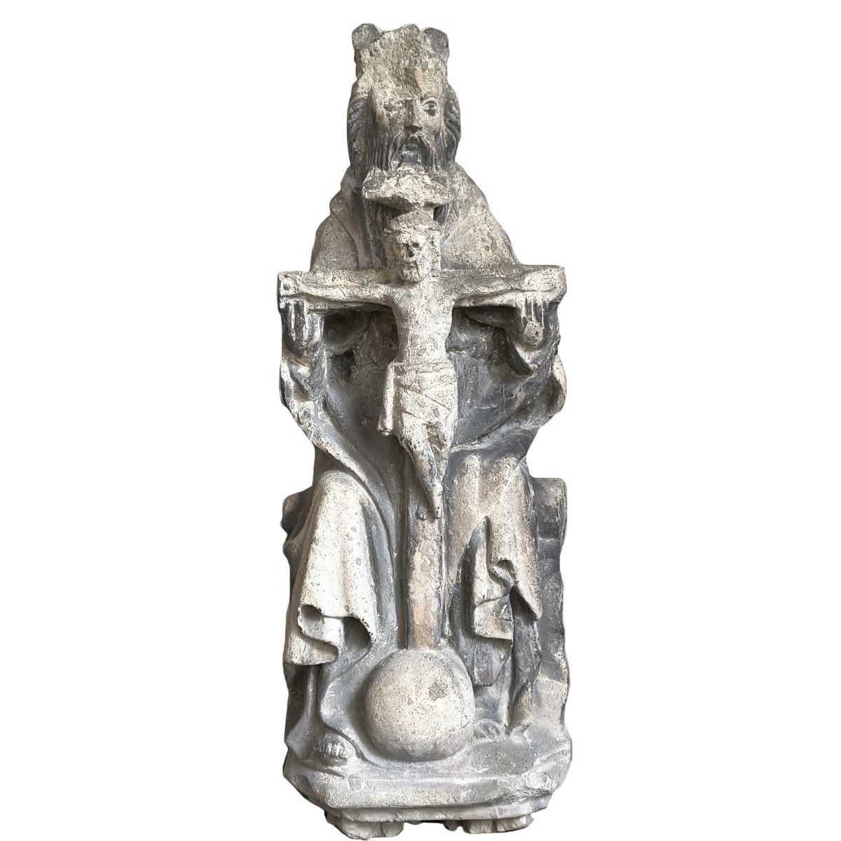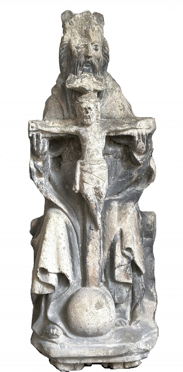 Accidents and missing parts, particularly the head of the dove and the crowned forehead of God the Father. Traces of polychromy and gilding, soiling due to candle smoke in particular.