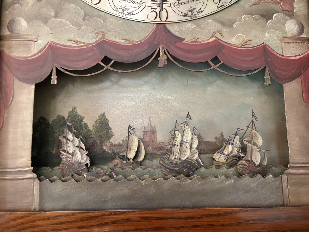 Silvered and engraved chapter ring with Roman hour numerals and Arabic minute numerals. Centre seconds hand with apertures for month, day and moon phase. The movement signed and inscribed Johan Smit Amsterdam. The dial is painted as a theatrical backdrop depicting a Dutch bay with sailing ships (scheepjes) that rock in time with the escapement – a technically accomplished and decoratively distinctive feature of high-end Amsterdam clockmaking of the 18th century. Quarter-hour strike on one bell; hour and half-hour strike on two bells. Brass weights. The movement is in running order.