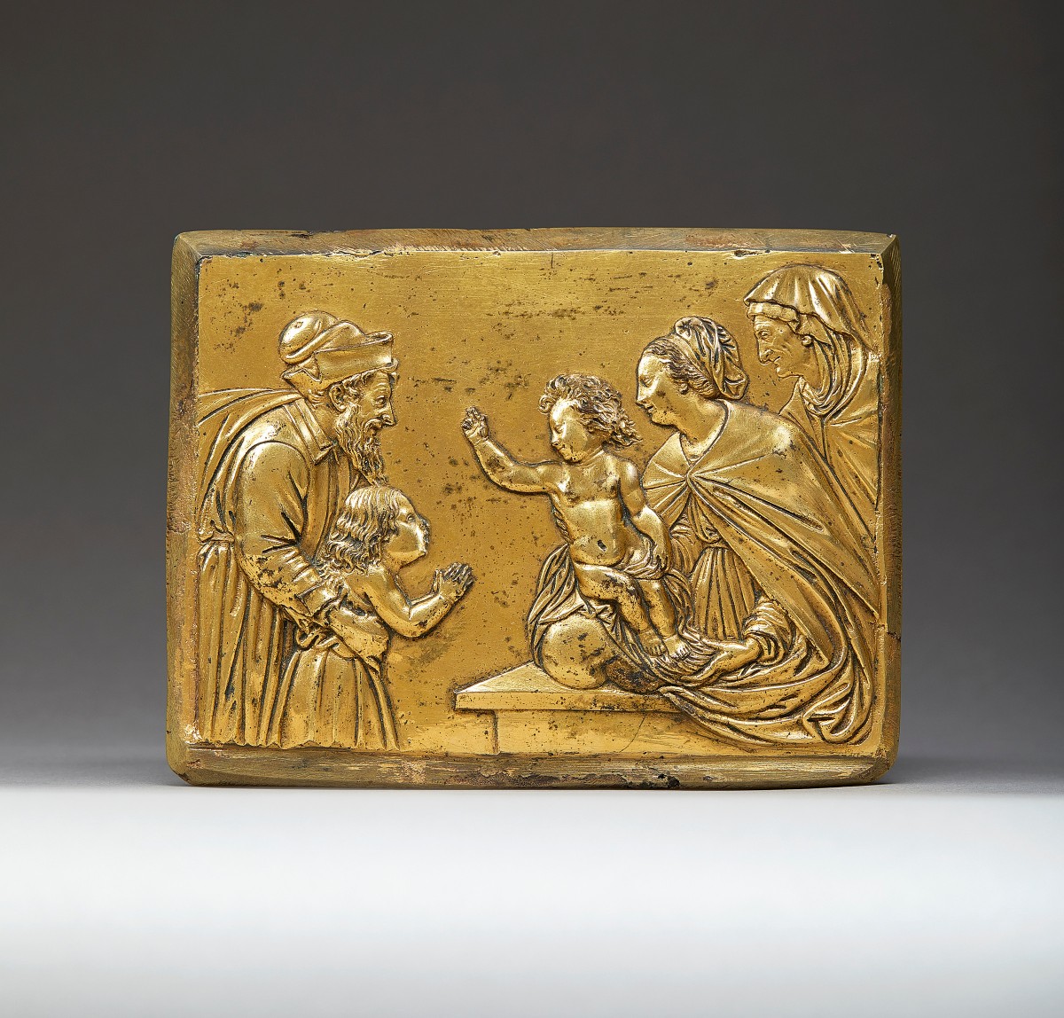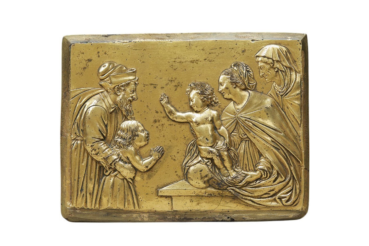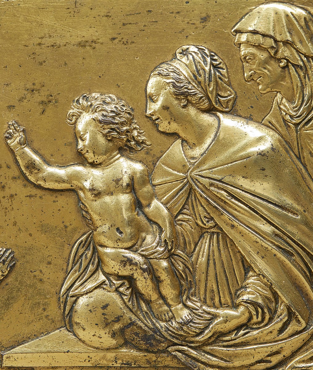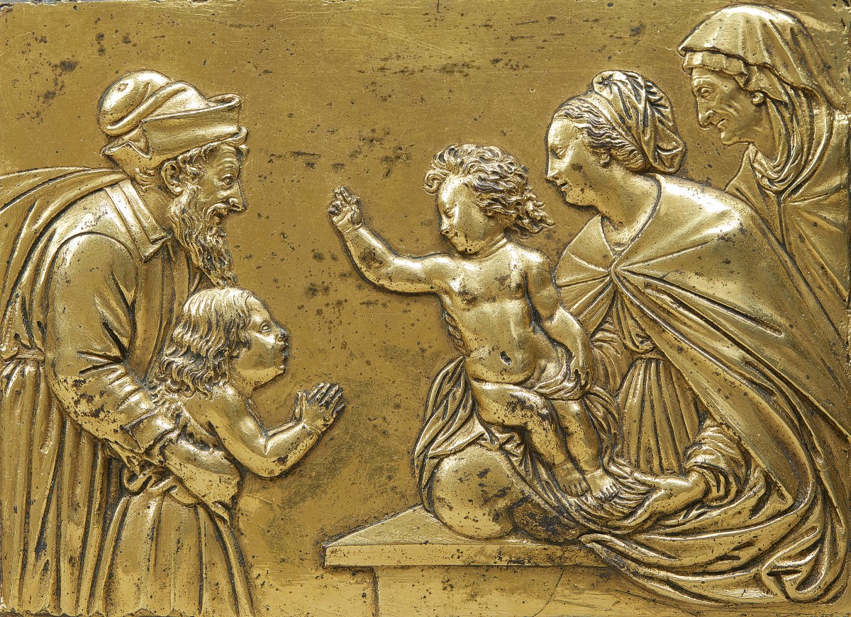 This outstandingly well-realised narrative plaque, showing Zachariah presenting the infant John the Baptist to the Christ-child, the Virgin and St Anne, was clearly designed to be framed for devotional purposes.