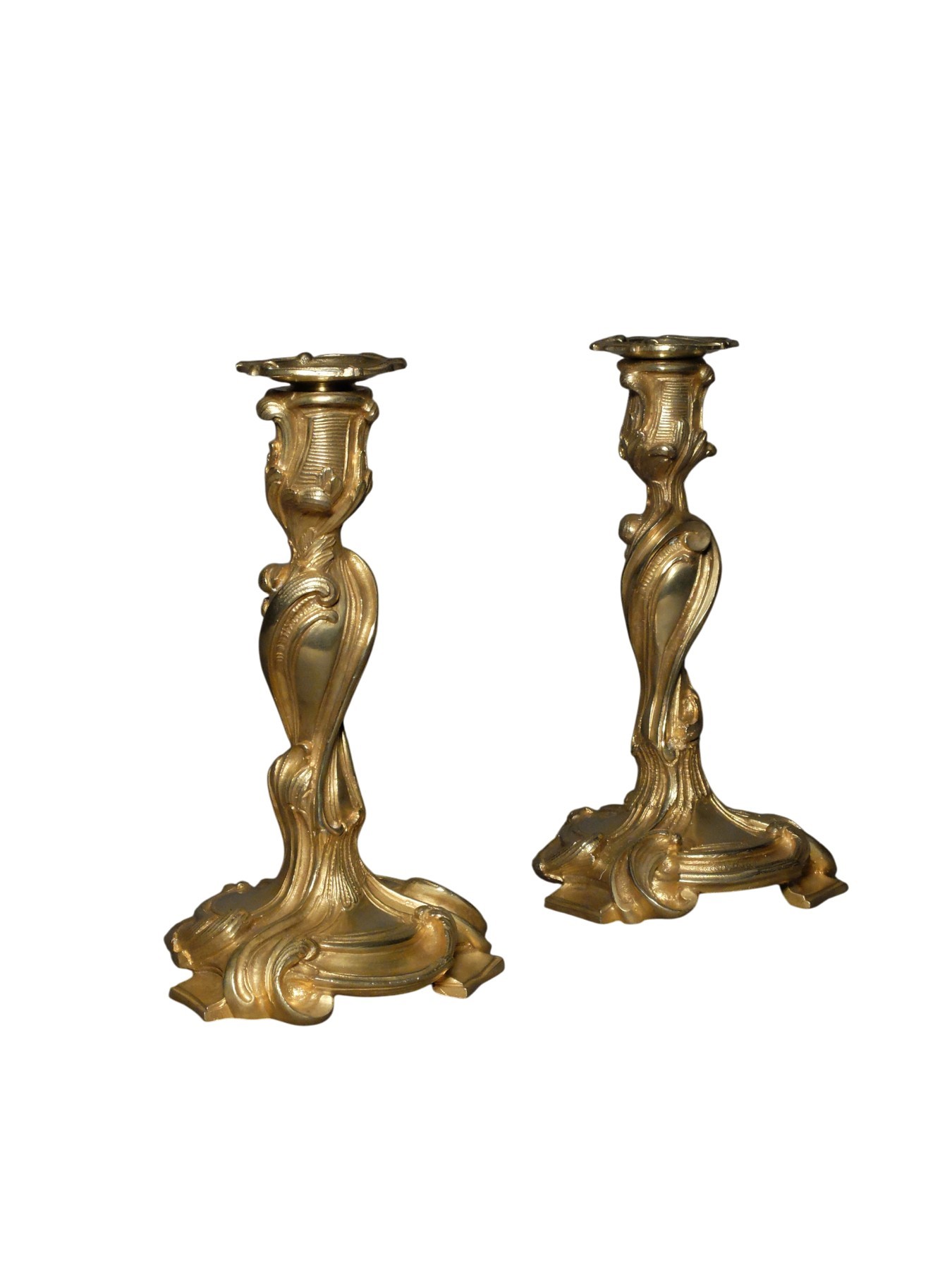 Pair of rocaille candlesticks in chased and gilded bronze.
