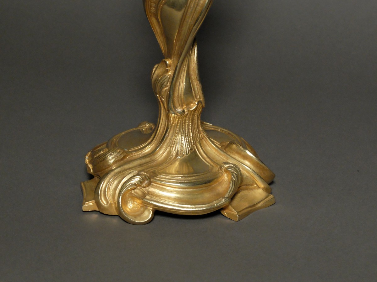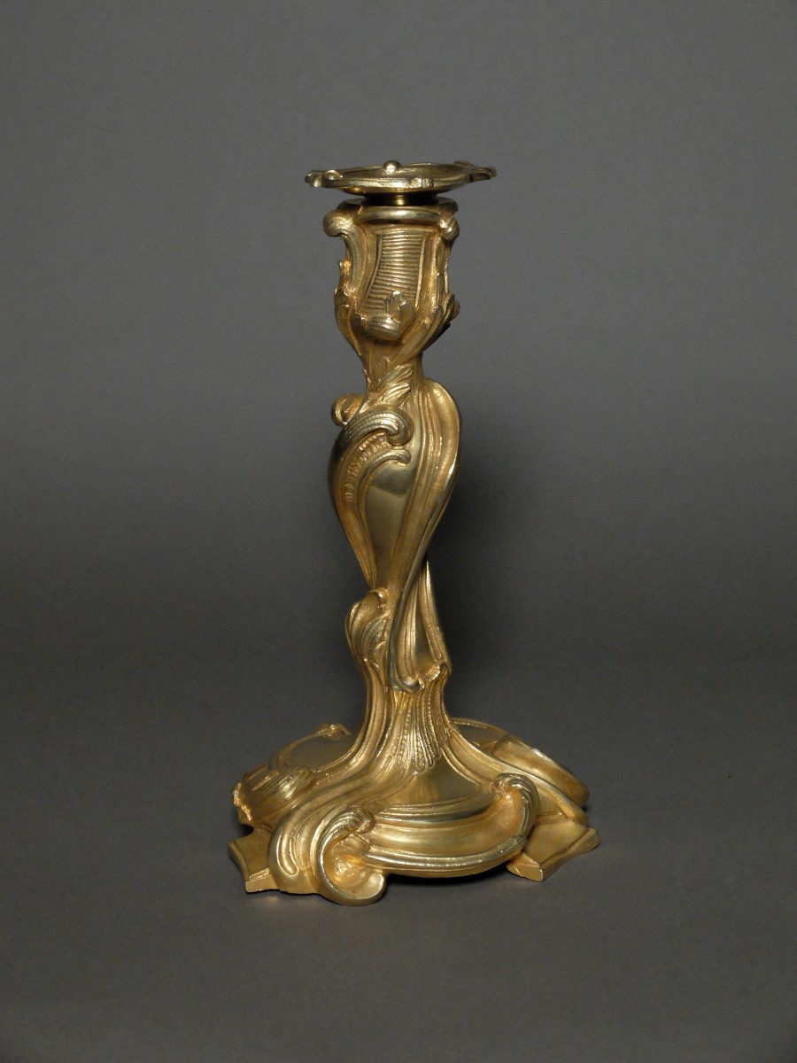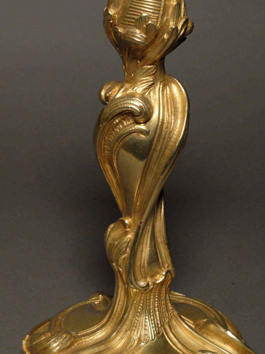 Characteristic of the rocaille style flirting with rococo, these candlesticks are inspired by the designs of Juste-Aurèle Meissonnier (1695-1750), a French draughtsman, silversmith and ornamentalist considered by his contemporaries to be one of the leaders of the rocaille.