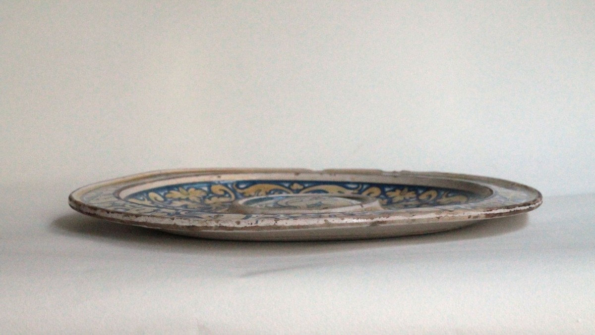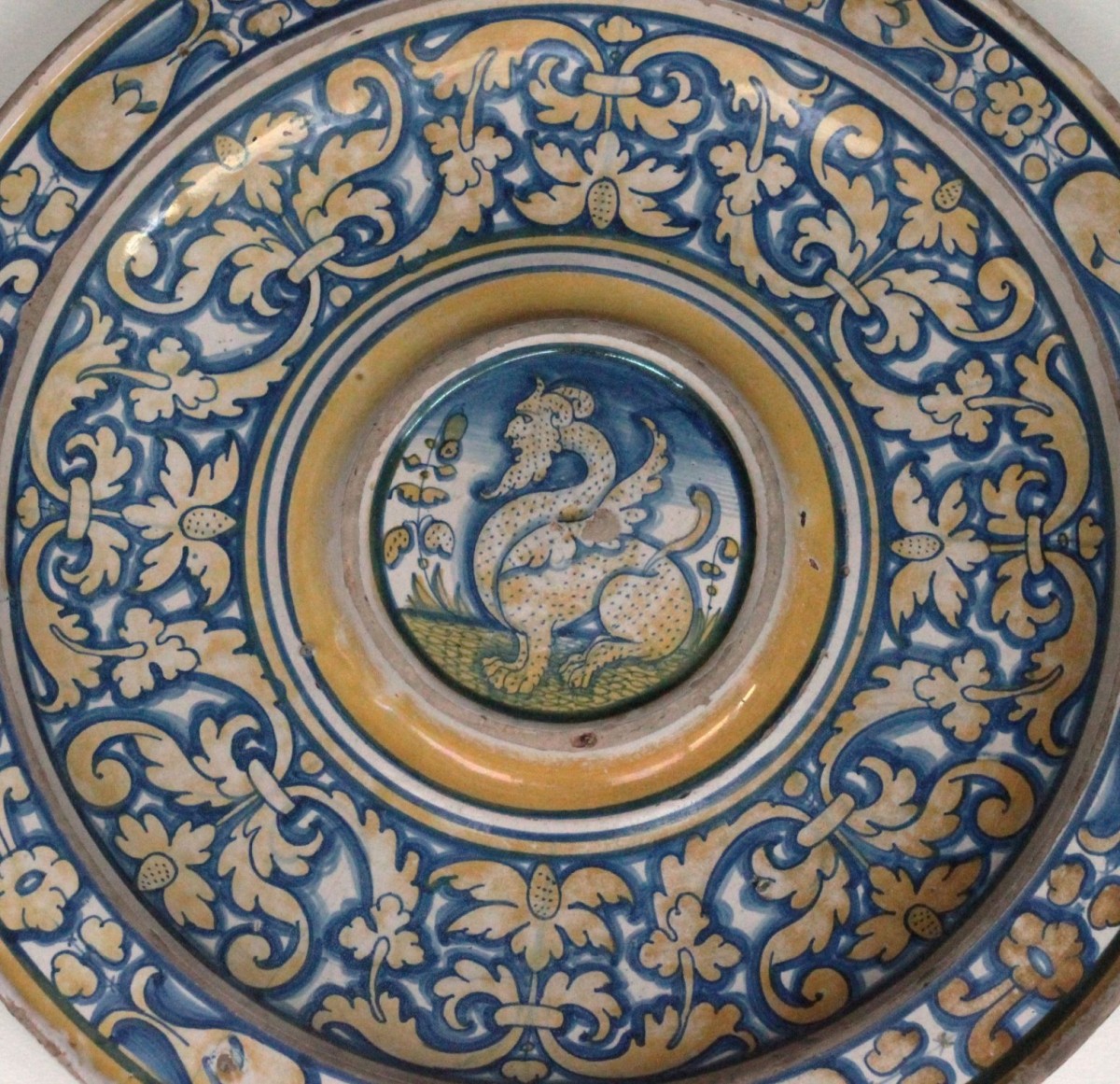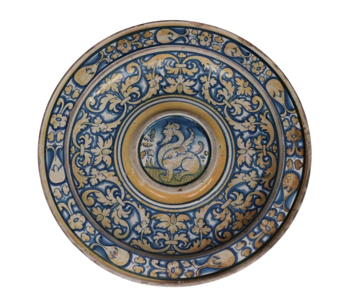 Deruta (Italy) majolica ewer or navel dish with a metallic gold-yellow lustre decoration, featuring in the center a bearded, horned, winged mythical creature framed by a lustre border and blue fillets. Inside the bowl, scrollwork foliage and stylized flowers, encircled, form a garland; on the rim, a band of scrolls, foliage, and flowers, between two fillets.