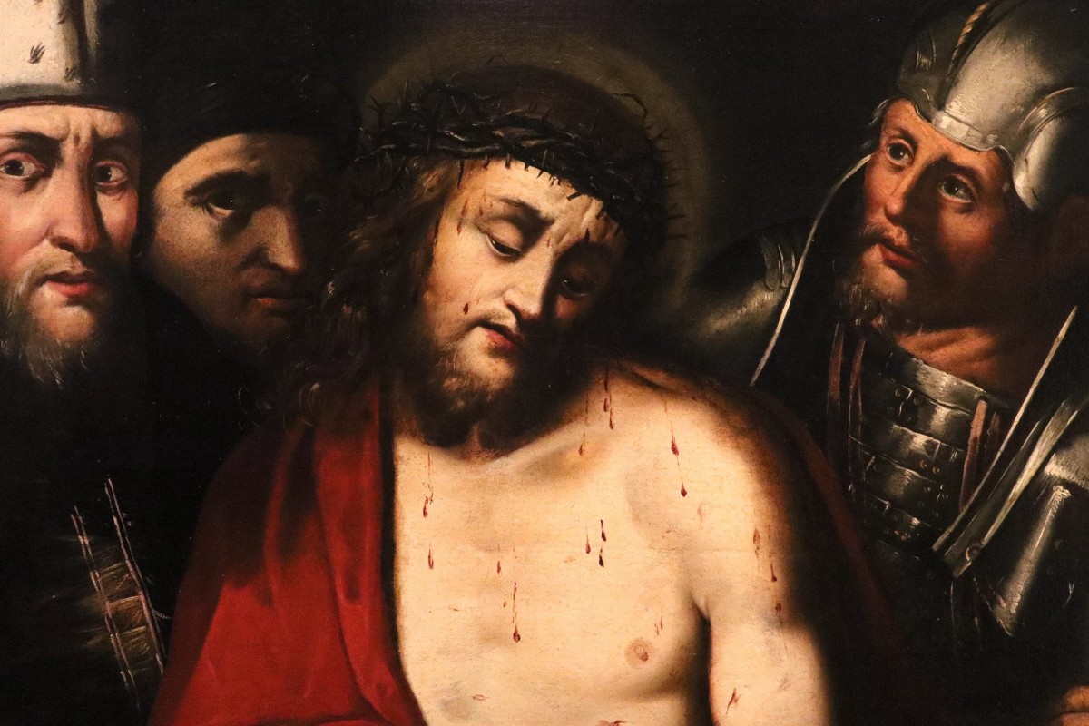 The Ecce Homo, the subject of this powerful canvas, depicts the Gospel episode in which Jesus, awaiting his sentence and following his scourging, is presented to the crowd by the Roman governor Pontius Pilate, portrayed here at his side wearing an oriental-style turban.