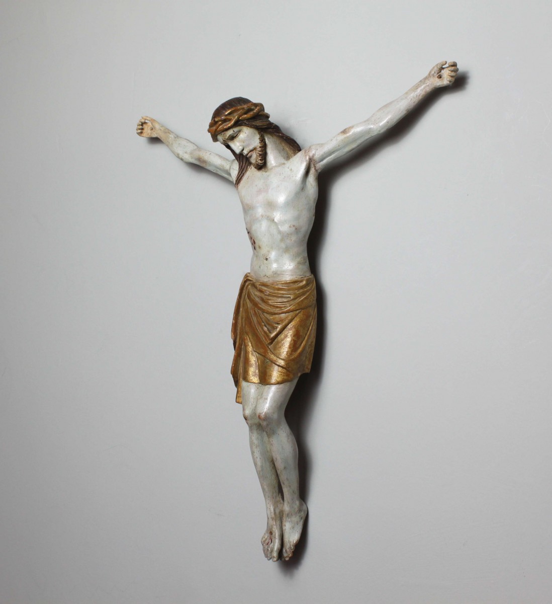This fine Corpus Christi figure likely originates from a crucifix in a church or private chapel. Here Christ is shown wearing a crown of thorns and gilded perizonium, His wounds highlighted with drops of painted blood. It is carved with fine anatomical detailing of the ribcage and downturned face. The reverse shows signs of old wear, suggesting it was fixed to a Cross.
