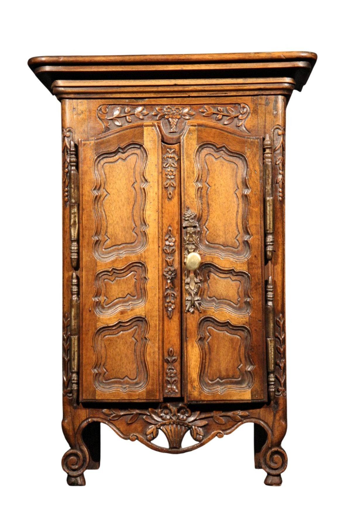 Small master piece of furniture representing a Provençal wedding armoire (wardrobe) with its two doors with scalloped panels and its openwork low crossbar decorated with the marriage basket.