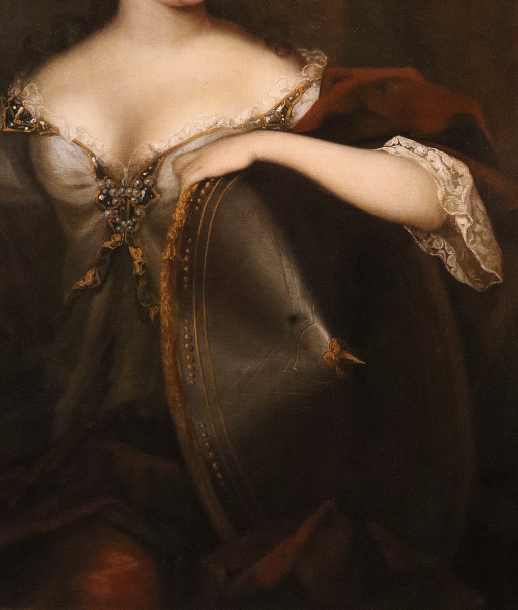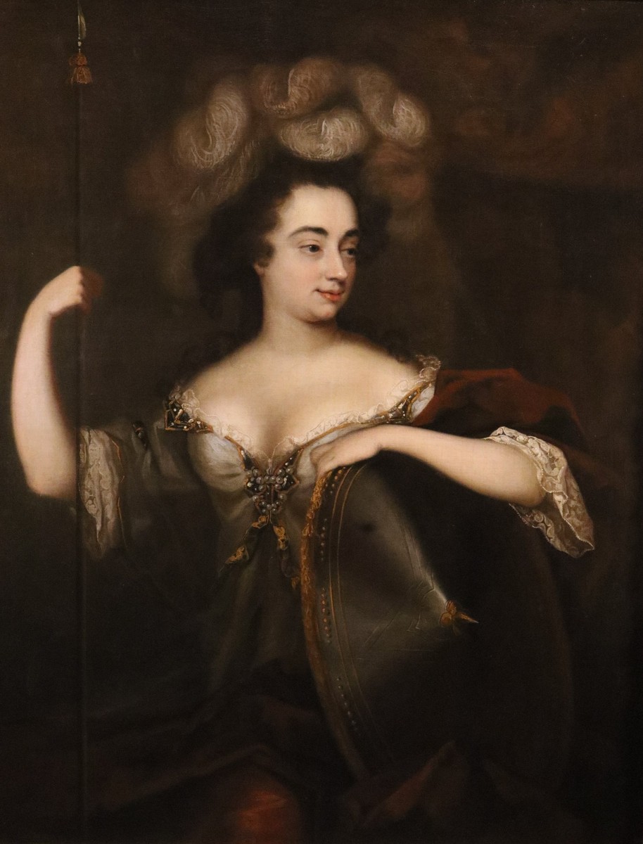 It is a portrait of an elegant lady depicted with the attributes of the Roman goddess Minerva, namely a large shield, known as an aegis, upon which her left forearm rests, and a spear which she holds proudly in her right hand. The subject is believed to be Sarah Churchill (1660–1744), Duchess of Marlborough, one of the most influential figures in English history and a friend of Princess Anne Stuart of England.