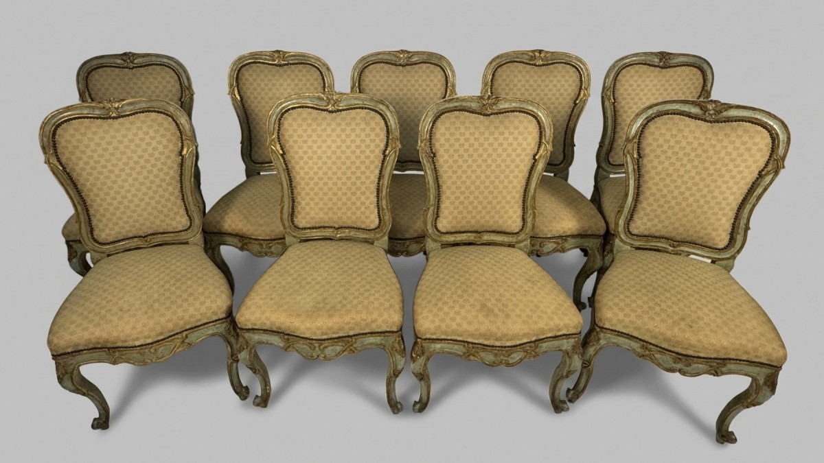 Set of nine green lacquered wooden chairs with gold trim, 18th century. The backrest is contoured with intertwined scrollwork trim, forming a small leaf motif; the same decoration is repeated on the waistband. Arched legs with a rocaille motif and curled feet. The backrest and seat are padded and upholstered in yellow fabric with small lilies. 97 x 52.5 x 47 cm.