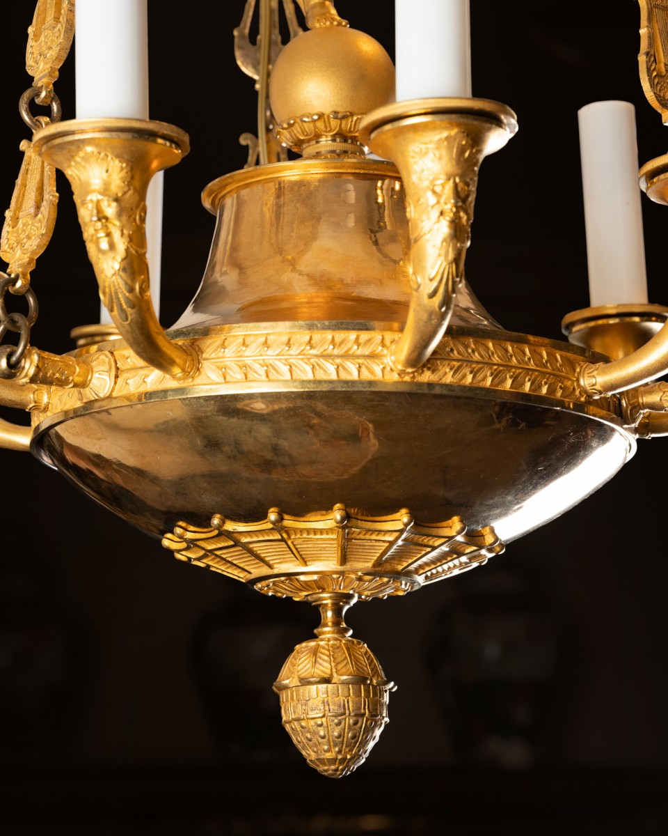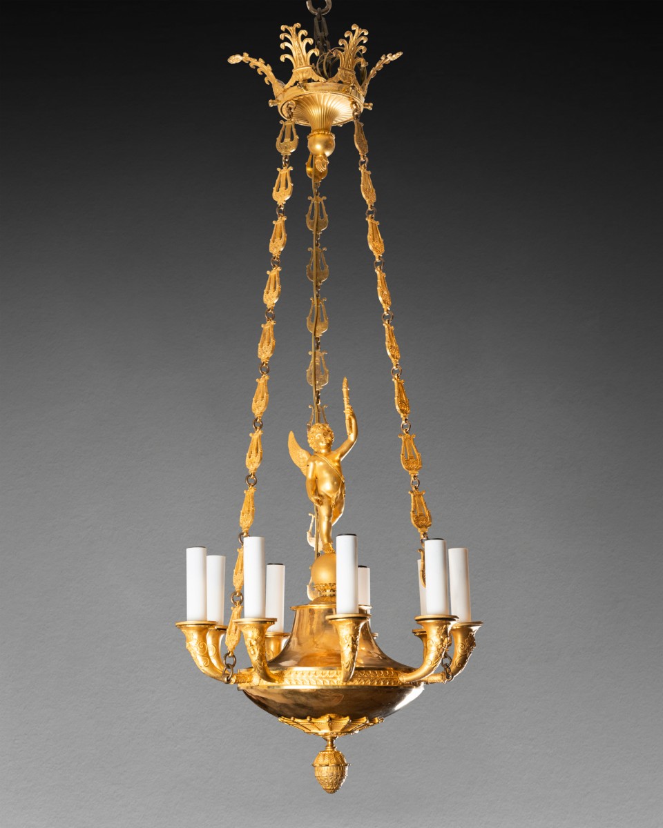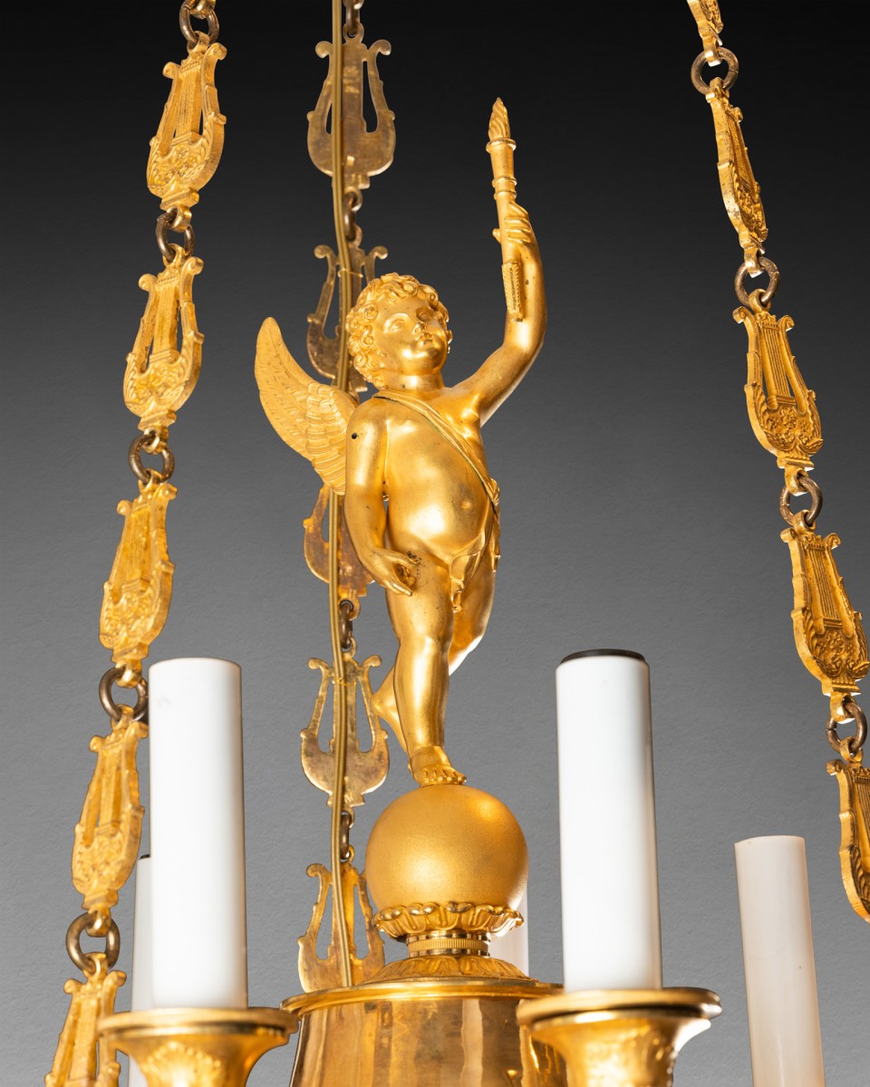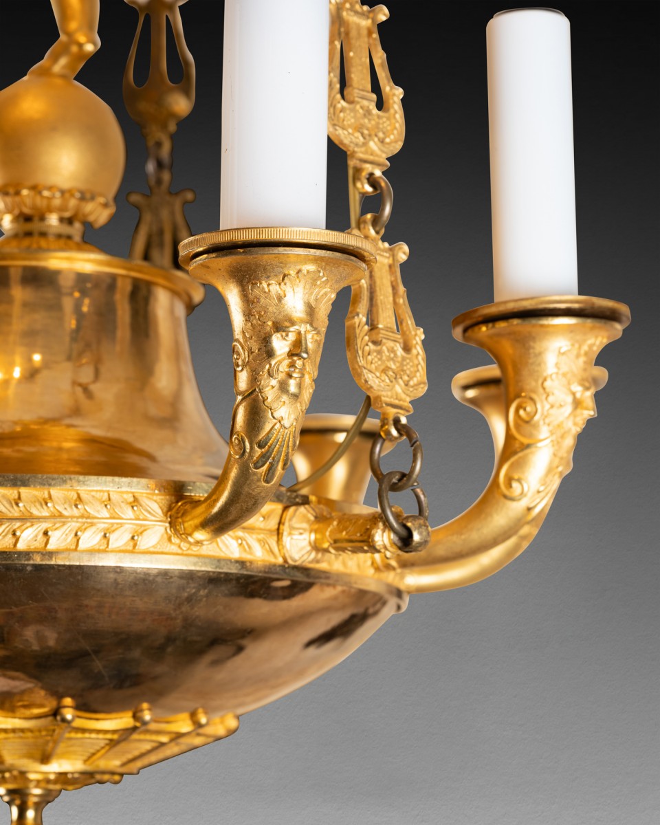 An Empire-period gilded bronze chandelier, consisting of an antique-style lamp adorned with nine trumpet-shaped arms, decorated with classical figures forming the light fixture, supported by three wide chains composed of lyre-shaped links, and connected to an upper canopy adorned with six palmettes.