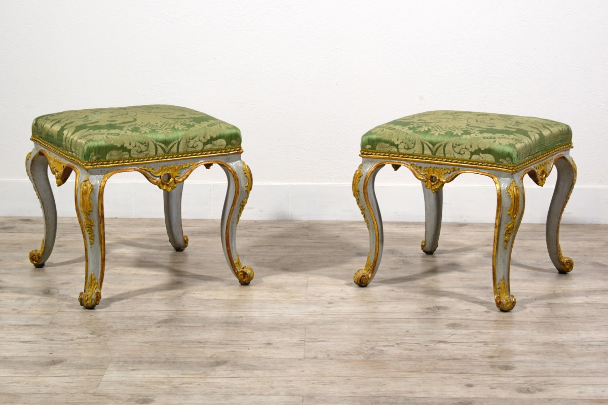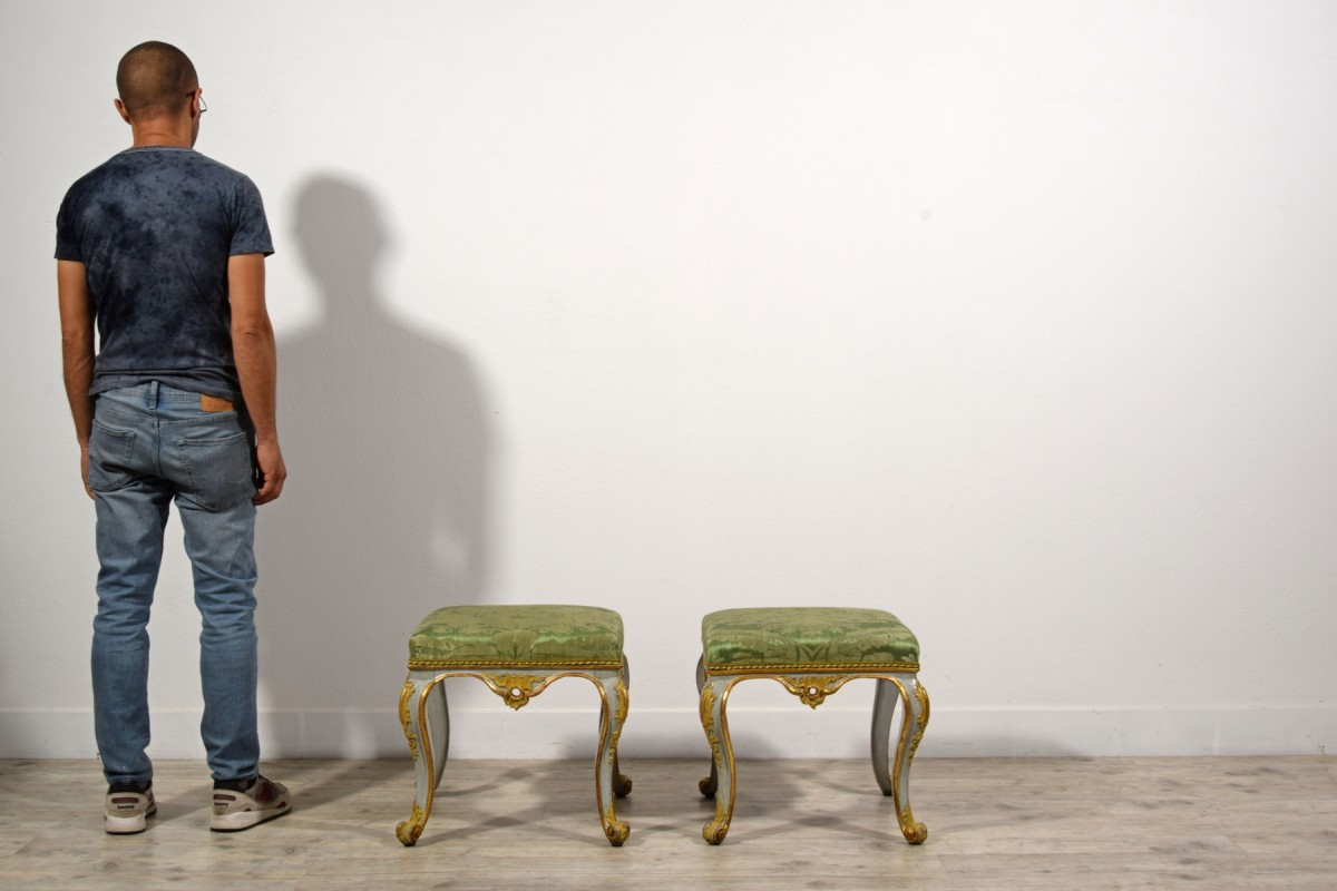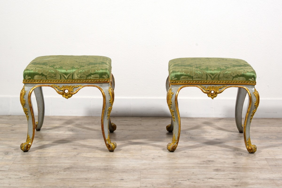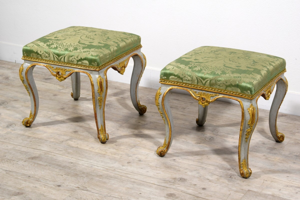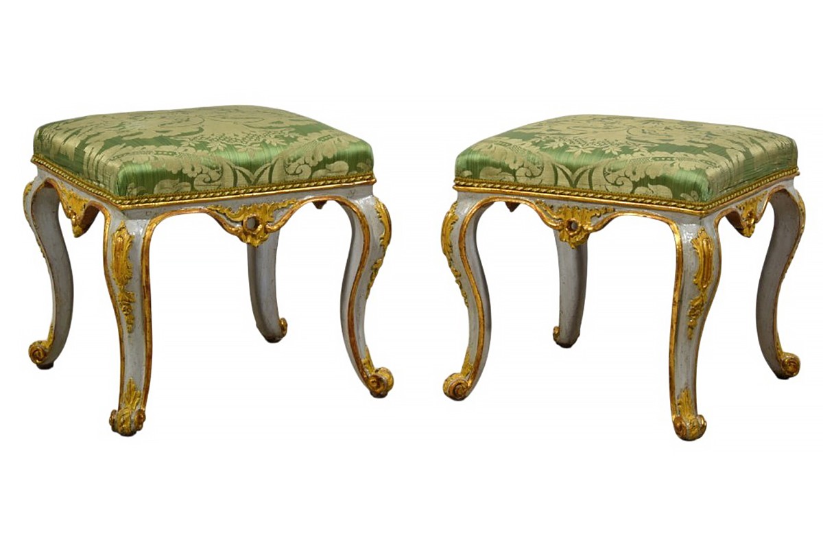 Pair of carved, lacquered, and gilded wooden stools, Barocchetto period, Turin, mid-18th century