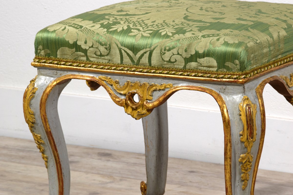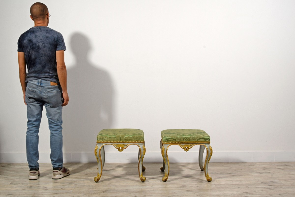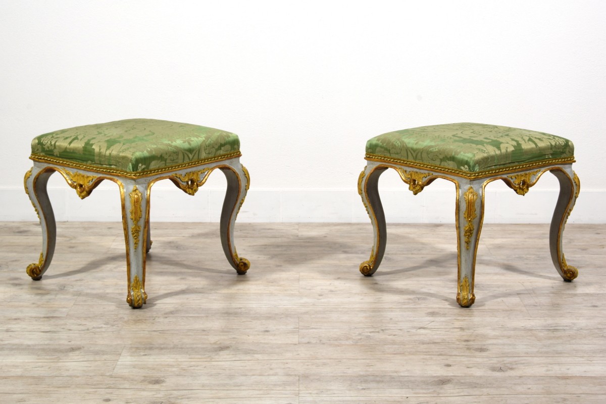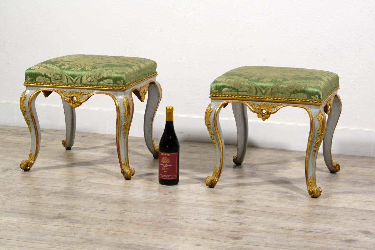 Pair of carved, lacquered, and gilded wooden stools, Barocchetto period, Turin, mid-18th century