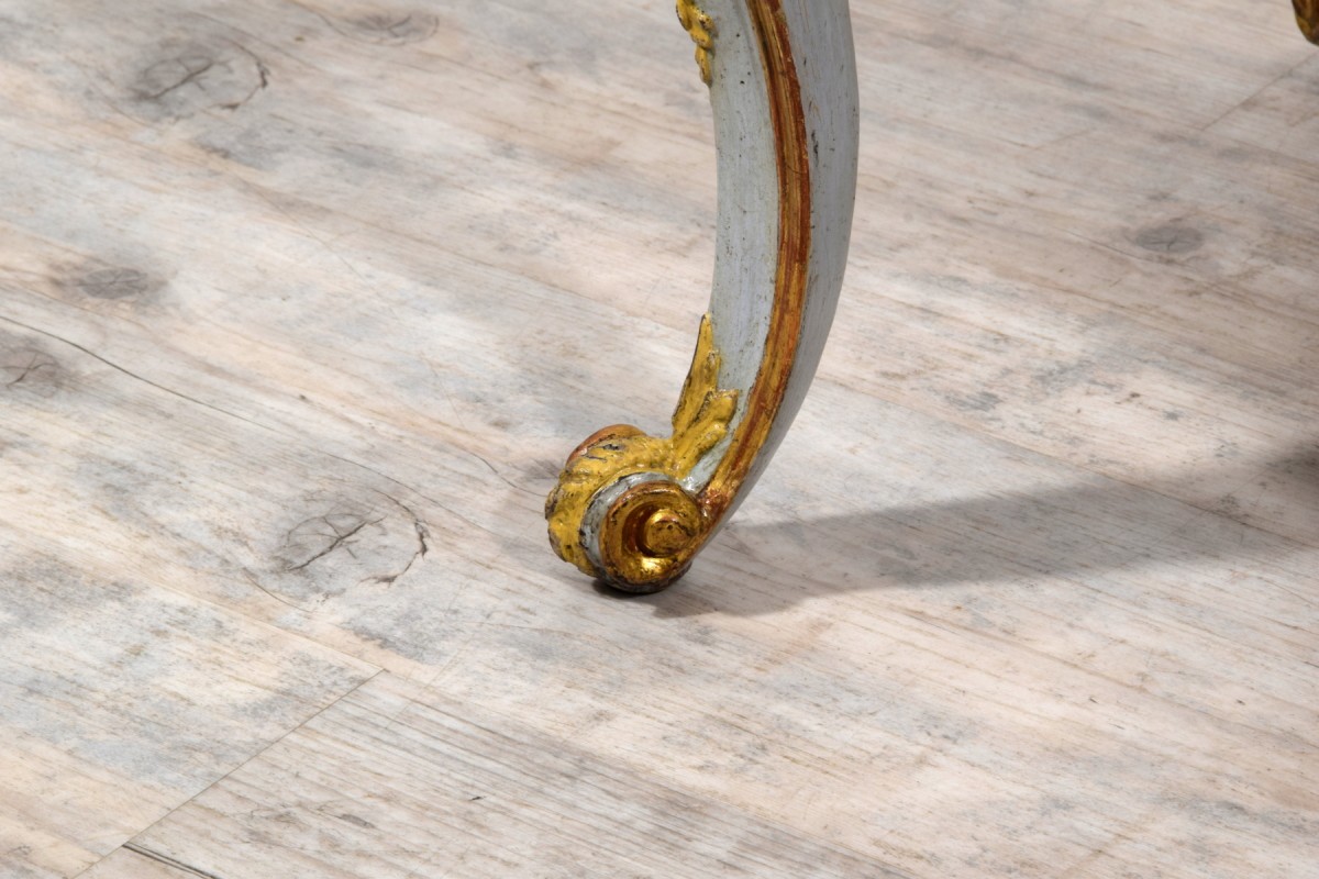 This refined pair of stools was crafted in Turin during the Barocchetto period (Rococo), around the mid-18th century. Each stool features a seat upholstered in green fabric, in good condition, outlined by a gilded wooden trim that defines its perimeter. The carved wooden structure is lacquered in blue and decorated with raised reliefs lacquered in yellow. Finished on all four sides, the stools display a central rocaille-style motif with phytomorphic decorations and a pierced central element highlighted in gold.