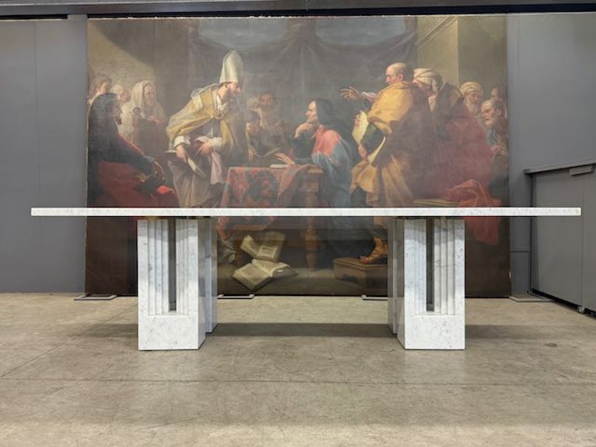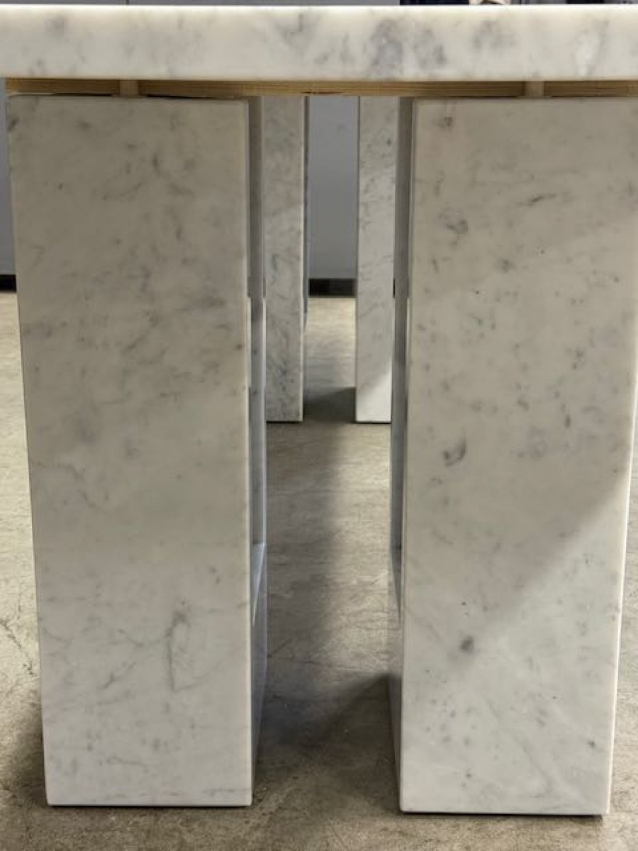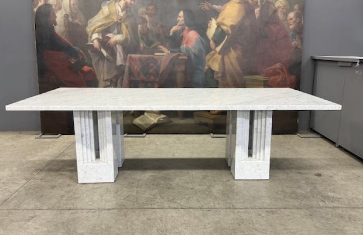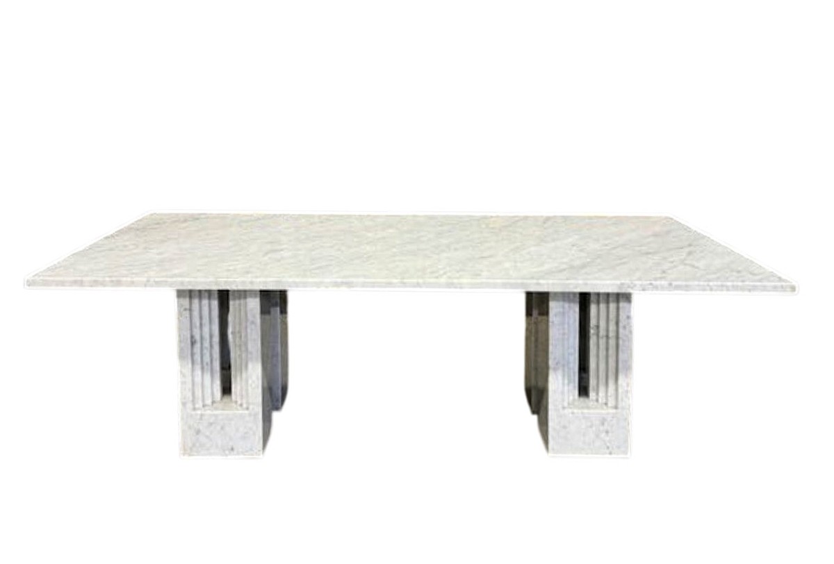 The table is composed of four monolithic bases in sculpted white Carrara marble.