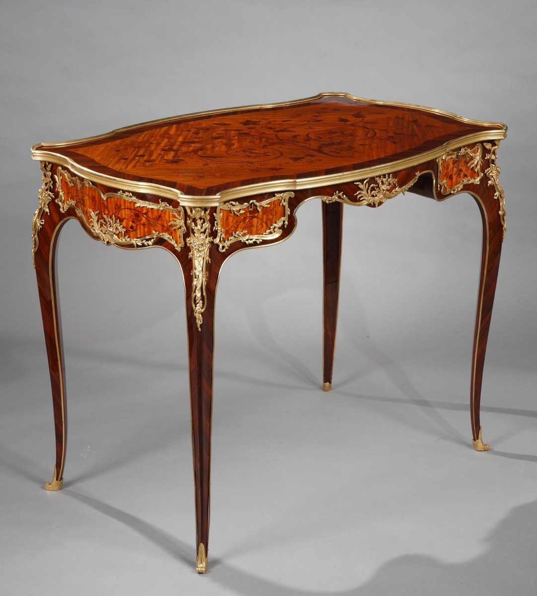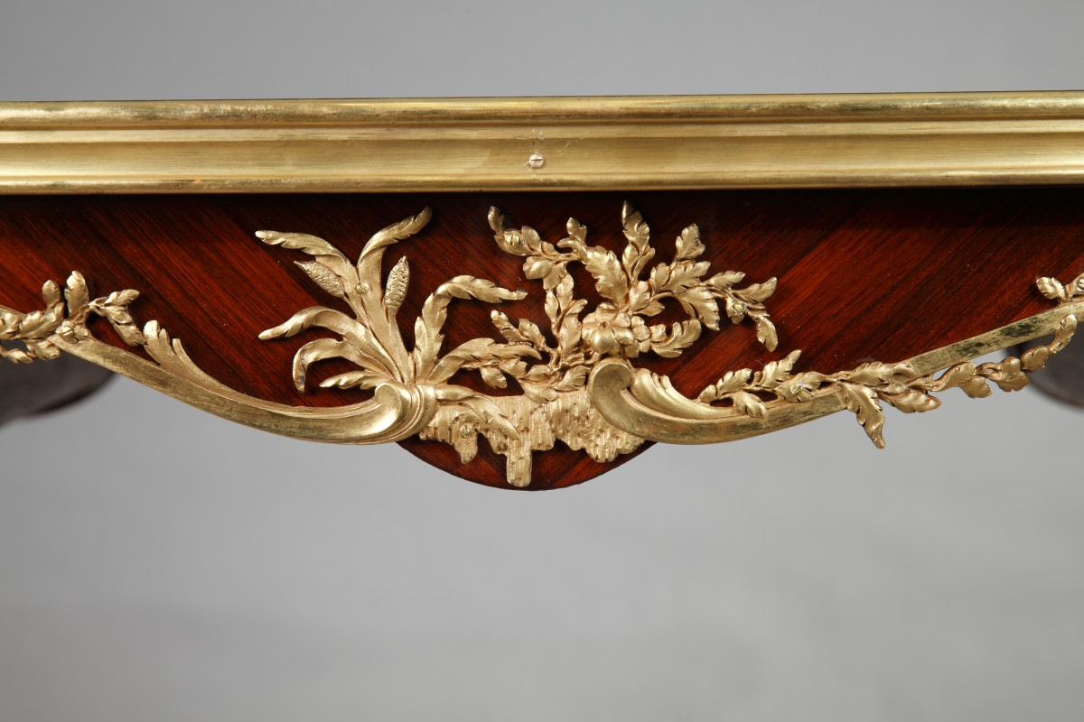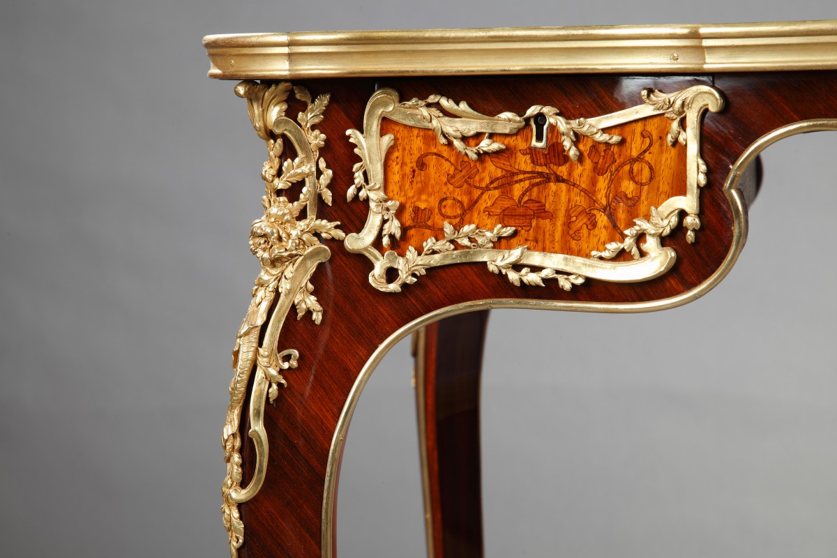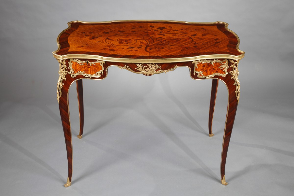 Charming serpentine shaped Louis XV style table in rosewood and kingwood veneer attr. to J.-E. Zwiener, with an elegant “bois de bout” floral marquetry on the tray and opening with two drawers. Rich gilded bronze ornamentation of flowers and branches framing the drawers and on the angles. The back is similarly decorated and with two false drawers. Resting on four scalloped foliate-cast feet.