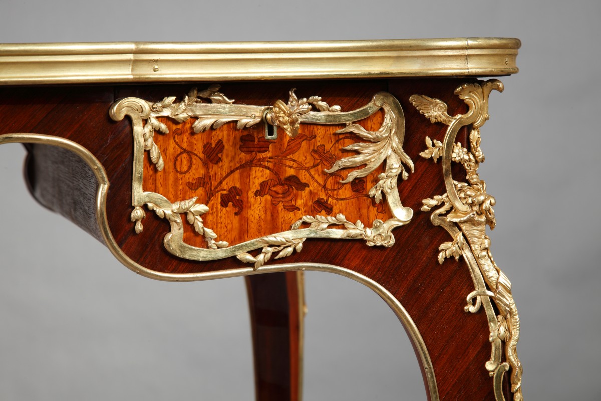Joseph-Emmanuel Zwiener was born in Germany in 1849. In 1880 he set up his extensive workshops in rue de la Roquette in Paris where he created many original pieces of furniture. He immitated practically every style, ranging from “Boulle” to “Louis XVI” and including extraordinary personal interpretations of the ‘’exhuberent’’ Louis XV style. His unique style won Zwiener the gold medal at the 1882 exhibition of the Union Centrale des Arts Décoratifs in Paris. One of the judges, René Ménard, remarked that « if Mr. Zwiener had limited himself to literal reproductions, he wouldn’t have attracted the attention of the jury so strongly. But alongside his very skillful copies, he has shown us works inspired by his own imagination ». He then participated in the 1889 Universal Exhibition, held in Paris, and was awarded the gold medal for his remarkable copy of that most famous piece of furniture, Louis XV’s desk. The catalogue of the exhibition included a wonderful elegy qualifying the work as perfect : « No criticism what-so-ever could be made ». As that other famous cabinet-maker François Linke (1855-1946), Zwiener had most of his bronzes modelled by Léon Messagé (1842-1901) whose work was considered as being of the best possible quality. Zwiener was active until 1895, when Jean-Henri Jansen (1854-1928) purchased his business and stock. Operating under the name of “Zwiener Jansen Successeur”, Jansen continued to faithfully produce Zwiener’s creations, using the original models and lavishing the utmost care on these “meubles de luxe”.