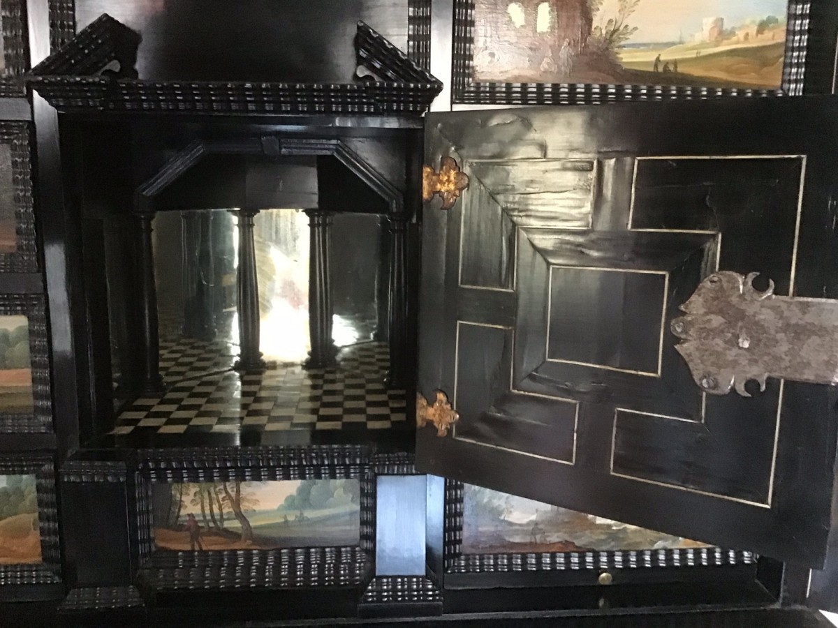 Ebony cabinet with raised framing decoration and wavy-edged borders, opening with two doors to reveal nine drawers and a central compartment containing a miniature theatre with parquetry inlaid ivory veneers and mirrors. A lower drawer opens with a lock, also operating the upper lid.