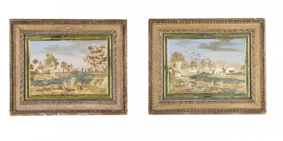 This pair of Compigné paintings represents two riverside landscapes, animated by characters navigating on the water. Rectangular in shape, each is made on stamped tin foil. The latter is enhanced with silver, gold leaf and gouache. This clever mix of materials produces an effect of perfect union between painting and engraving. In the first painting, the scene represents, in the foreground, the winding bank of a river. A first character, standing and seen from behind, contemplates the watercourse which stretches into the background. The silver-tinted horizontal lines used to represent the river evoke flat, peaceful water. Two men are busy docking their boat. On the opposite bank, on the left, a hamlet stands out, while two sailboats appear in the distance. A second hamlet, similar to the first, emerges through sparse vegetation. The second painting offers a similar scene. Three calm and peaceful stretches of water, interspersed with winding banks, structure the space. In one of them, a rider crosses the scene on horseback. On another, a figure from behind walks along the bank. In the background, a hamlet rises in the heart of lush vegetation. A sailboat and a boat, docked along the banks, complete the scene. Gold highlights, in varied tones, highlight certain details and create effects of contrast and shadow, giving a delicate relief and a subtle shimmer to the whole. The skies, treated with gouache in shades of bluish pink, convey the soft colors of the end of the day. This chromatic range passes harmoniously from pink to the deep gray of the clouds and birds flying over the scene. Each painting is housed in a frame decorated with gold edging, a frieze of pearls and water leaves.