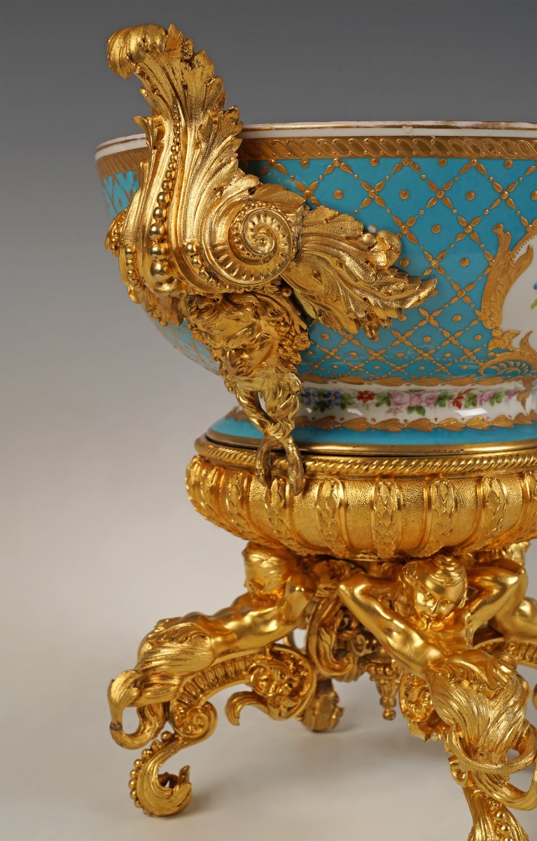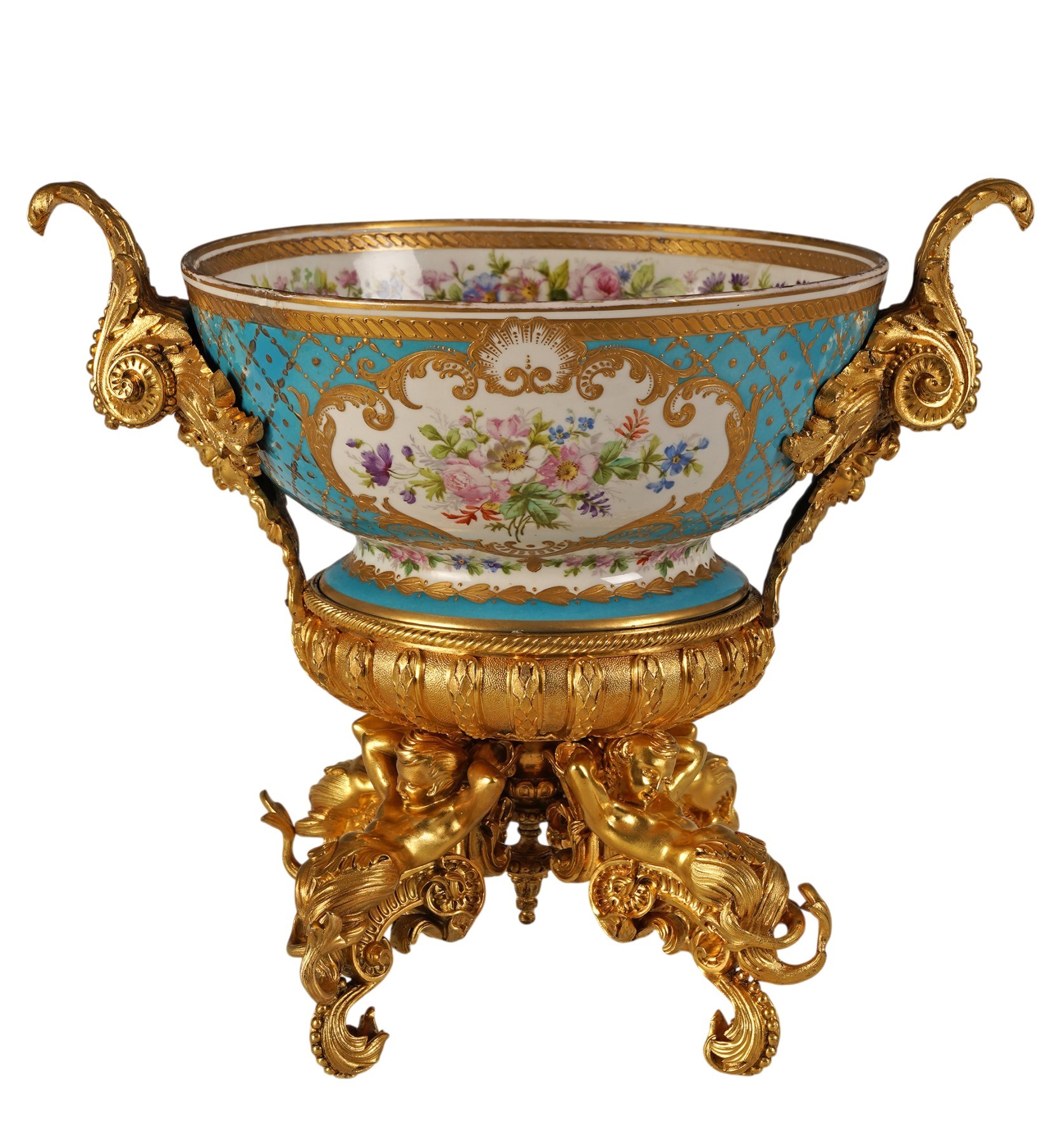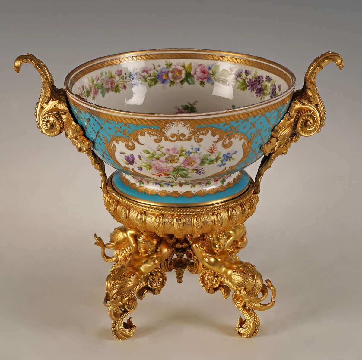 This bowl, belonging to the grand tradition of mounted objects, reflects a 19th-century production in the taste of the 18th century (more specifically the Louis XV style), characterized by the exuberance of rocaille decoration (asymmetry, scrolling foliage, tritons), the combination of precious materials (porcelain and gilt bronze), and a taste for spectacular centerpiece objects. It forms part of a prolific yet often highly refined production, oscillating between imitations of the royal Sèvres manufactory and original creations intended for a bourgeois or aristocratic clientele, appreciative of luxury and technical virtuosity.