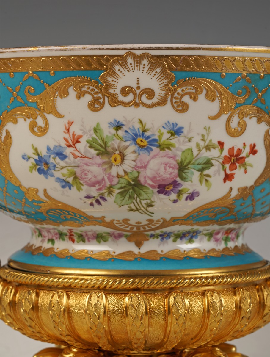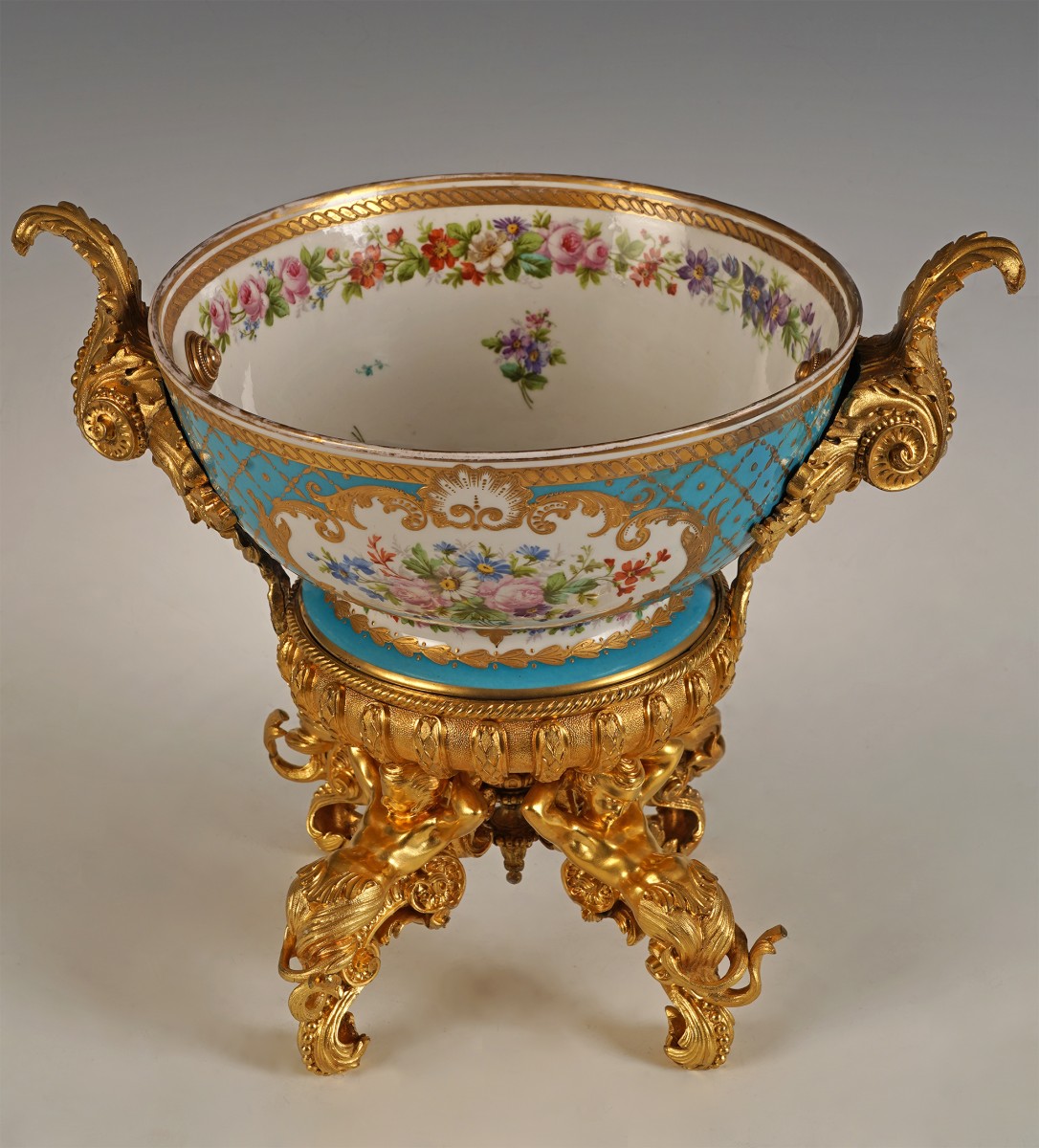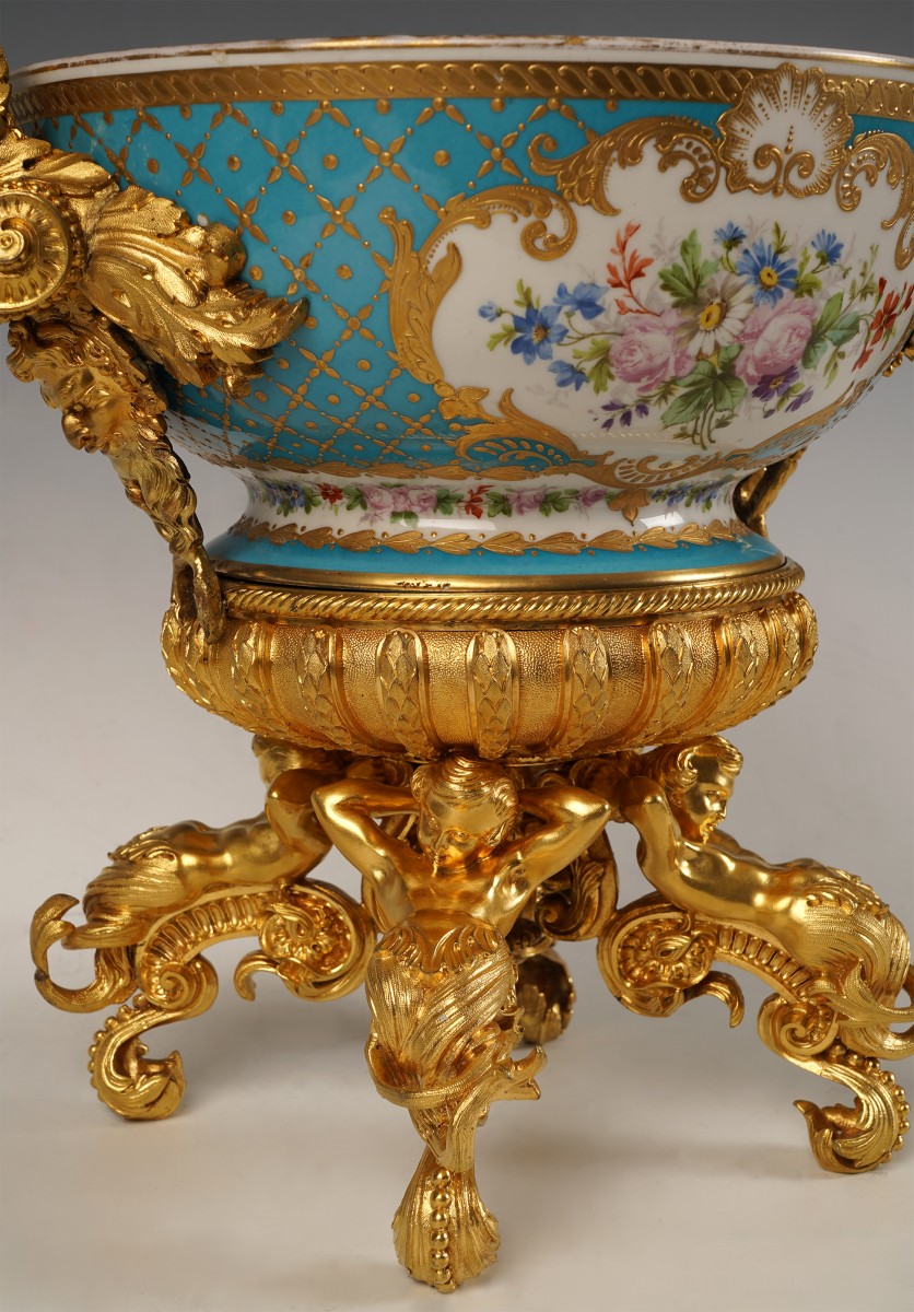 This bowl, belonging to the grand tradition of mounted objects, reflects a 19th-century production in the taste of the 18th century (more specifically the Louis XV style), characterized by the exuberance of rocaille decoration (asymmetry, scrolling foliage, tritons), the combination of precious materials (porcelain and gilt bronze), and a taste for spectacular centerpiece objects. It forms part of a prolific yet often highly refined production, oscillating between imitations of the royal Sèvres manufactory and original creations intended for a bourgeois or aristocratic clientele, appreciative of luxury and technical virtuosity.