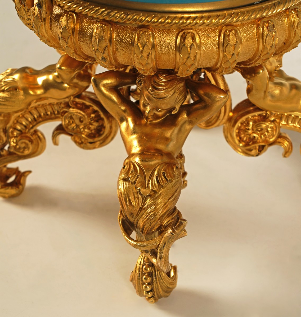 It is set in an ornate mount of finely chased and gilt bronze, composed of two lateral handles formed by scrolling acanthus leaves accented with beading and surmounting satyr heads; a gadrooned pedestal foot decorated with laurel leaves; and a quadripod base representing tritons as atlantes, reclining on asymmetrical rocaille-inspired volutes.