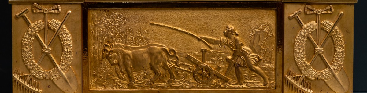 Stepped rectangular plinth, the central panel with a fine bas relief of a peasant ploughing with a pair of oxen drawing an araire, flanked on either projecting block by laurel wreaths crossed with rake and spade. Raised on six turned bun feet.