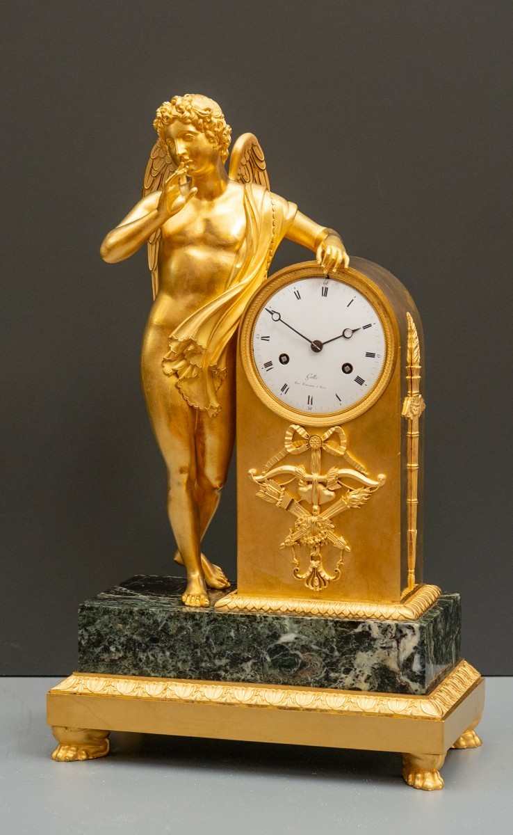 Fine French Empire mantel clock in chased and mercury-gilt bronze on a verde antico marble plinth, figuring Eros as Harpocrates, god of silence, standing with his right index finger raised to his lips and his left arm resting on the drum-form clock case. The winged adolescent is modelled in the round after the Antique, the drapery falling in rhythmic folds behind the body, the anatomy finely chased with alternating matt and burnished surfaces. The arched case is applied with a pendant trophy of love comprising a ribbon-tied bow, crossed quiver and torches beneath the dial, flanked to the right by an upright flaming arrow. The white enamel dial, signed Galle, Rue Vivienne à Paris, shows Roman hour numerals and Arabic five-minute markings, with pierced Breguet-style blued steel hands; twin winding arbors for the eight-day movement striking hours and half-hours on a bell. The whole raised on a rectangular verde antico marble base set on a gilt bronze plinth with lotus-leaf frieze and lion paw feet.