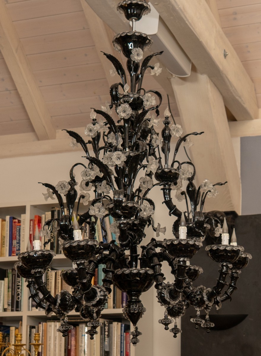 The dramatic contrast between the deep saturated black of the principal elements and the translucent clarity of the floral mounts is characteristic of a model particularly prized for its theatrical presence and rarely encountered at this scale. The type revives the eighteenth century lighting preserved at the Palazzo Ca' Rezzonico in Venice, a model reinterpreted by the Murano glasshouses from the later nineteenth century onwards.