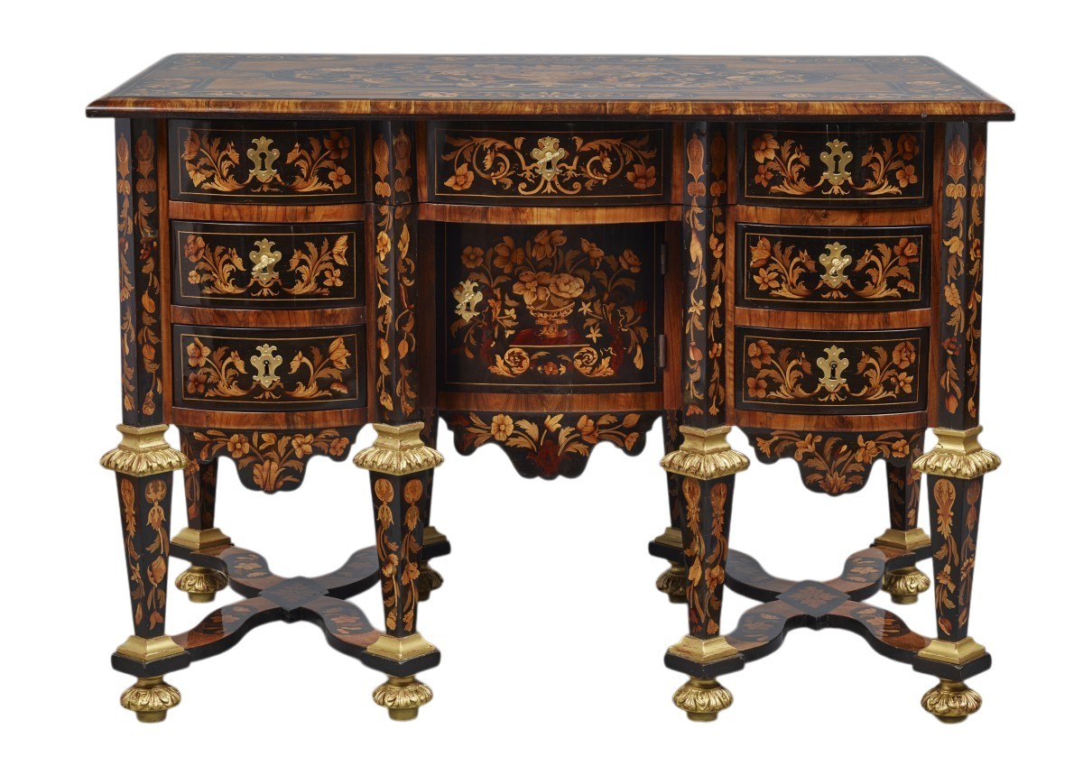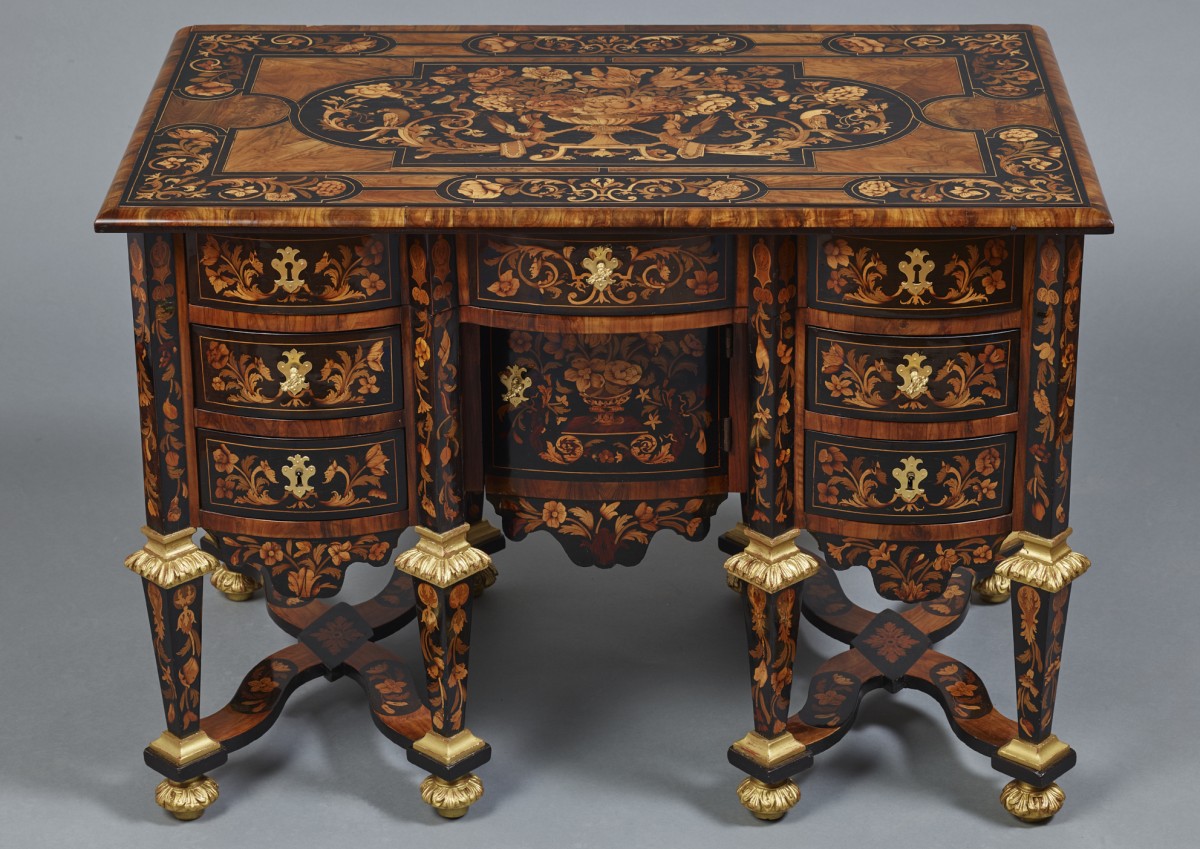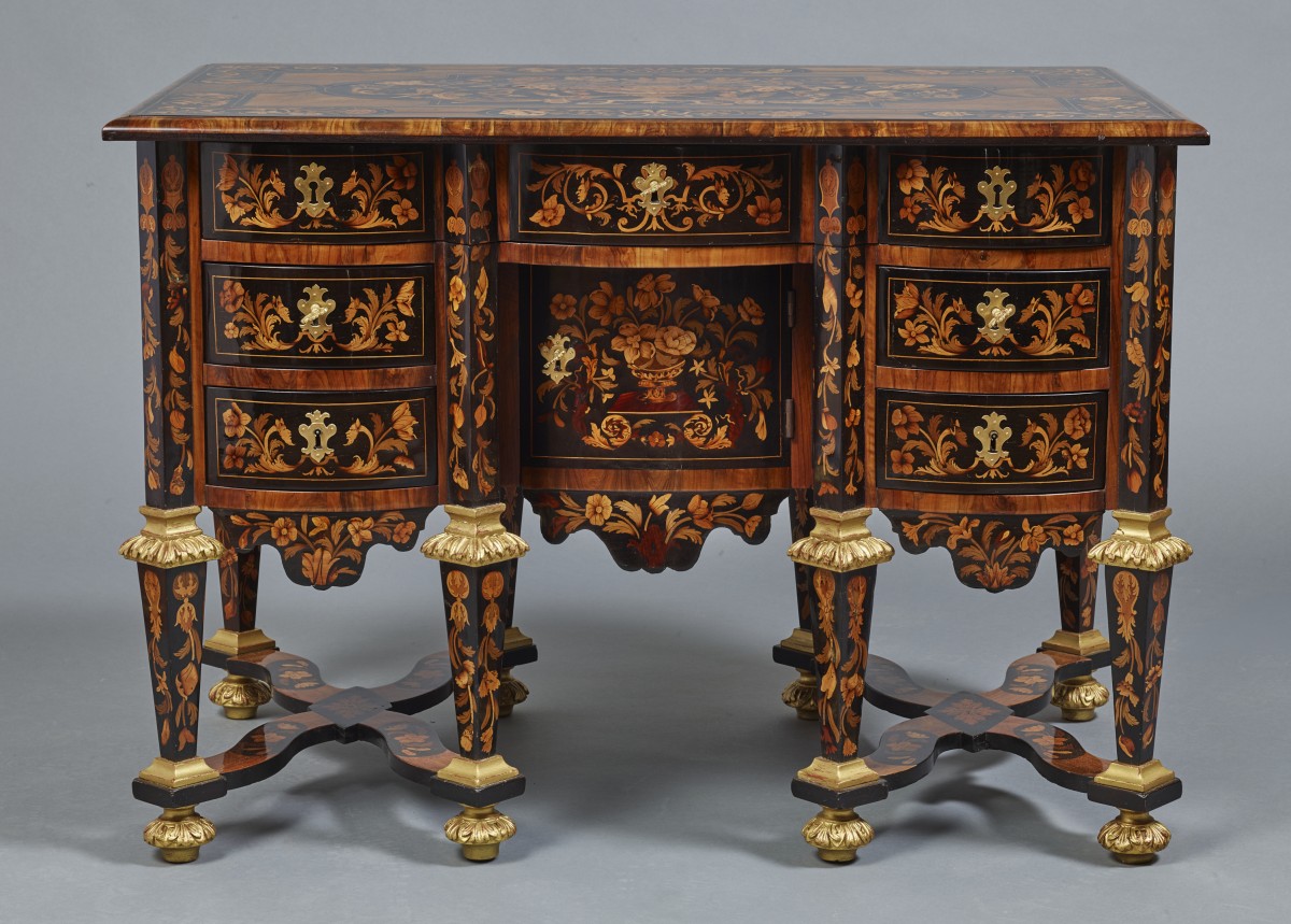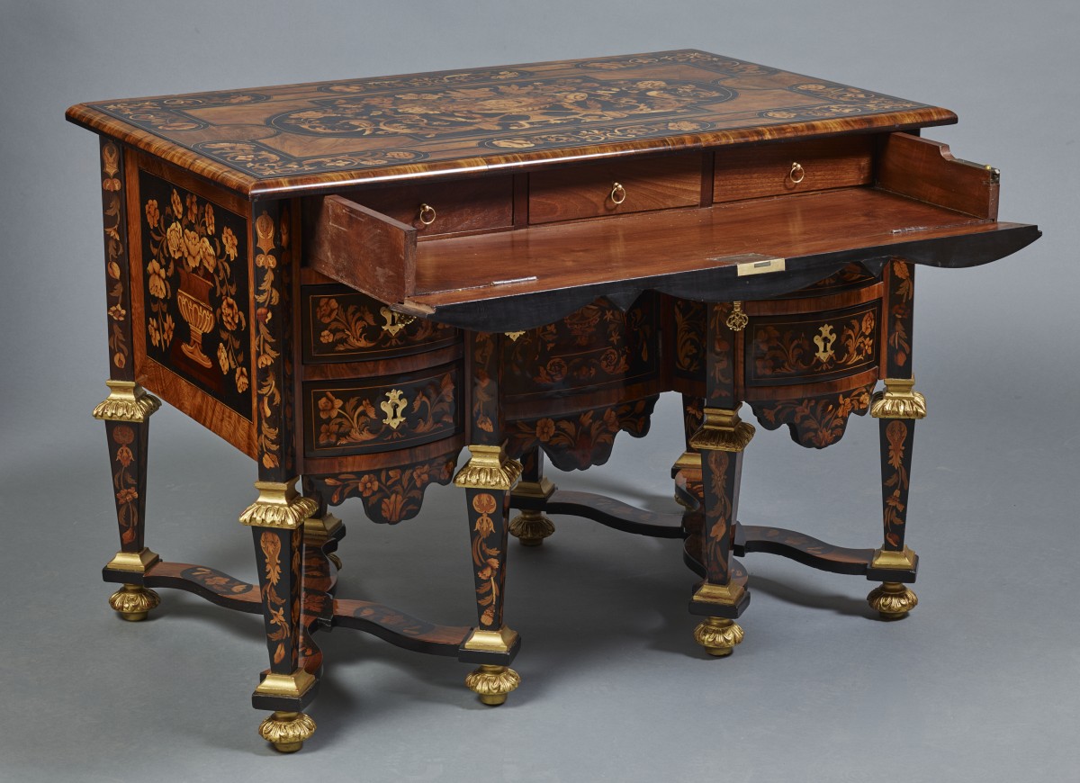 “Mazarin” desk richly inlaid with stained woods and ebony on an olivewood ground, opening with four drawers, a recessed central door, and a sliding upper drawer forming a writing surface and revealing a compartmented interior with three small drawers.