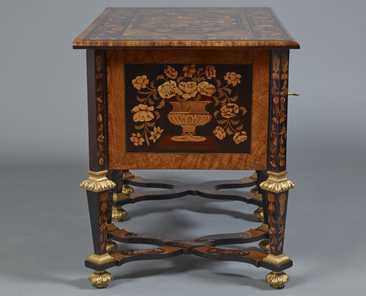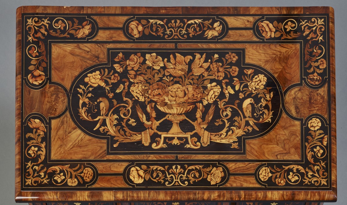 Rich marquetry decoration of scrolls, small flowers, birds, flower-filled vases, and satyrs across the top, façade, sides, uprights, and stretchers.