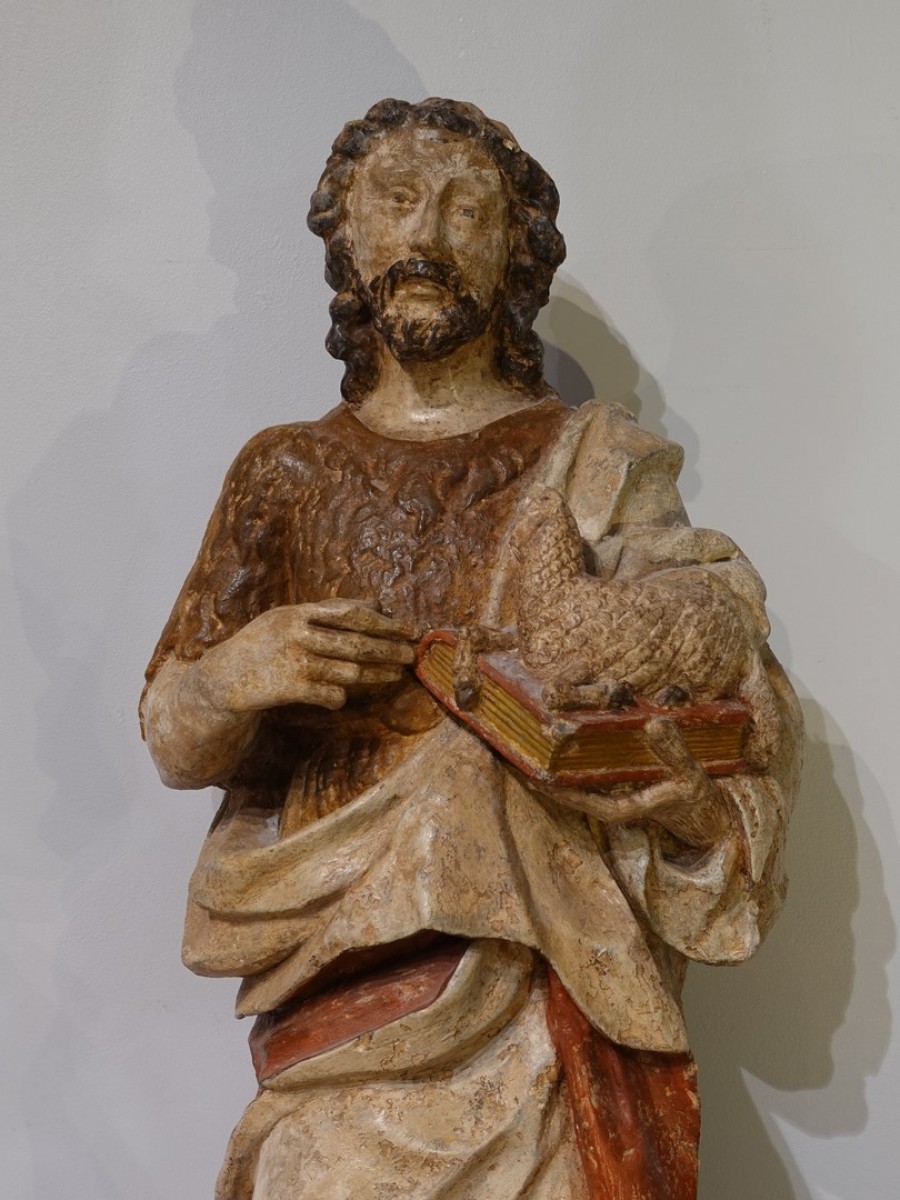 Saint John the Baptist is depicted in his traditional iconography, sculpted in limestone that has retained its polychromy.