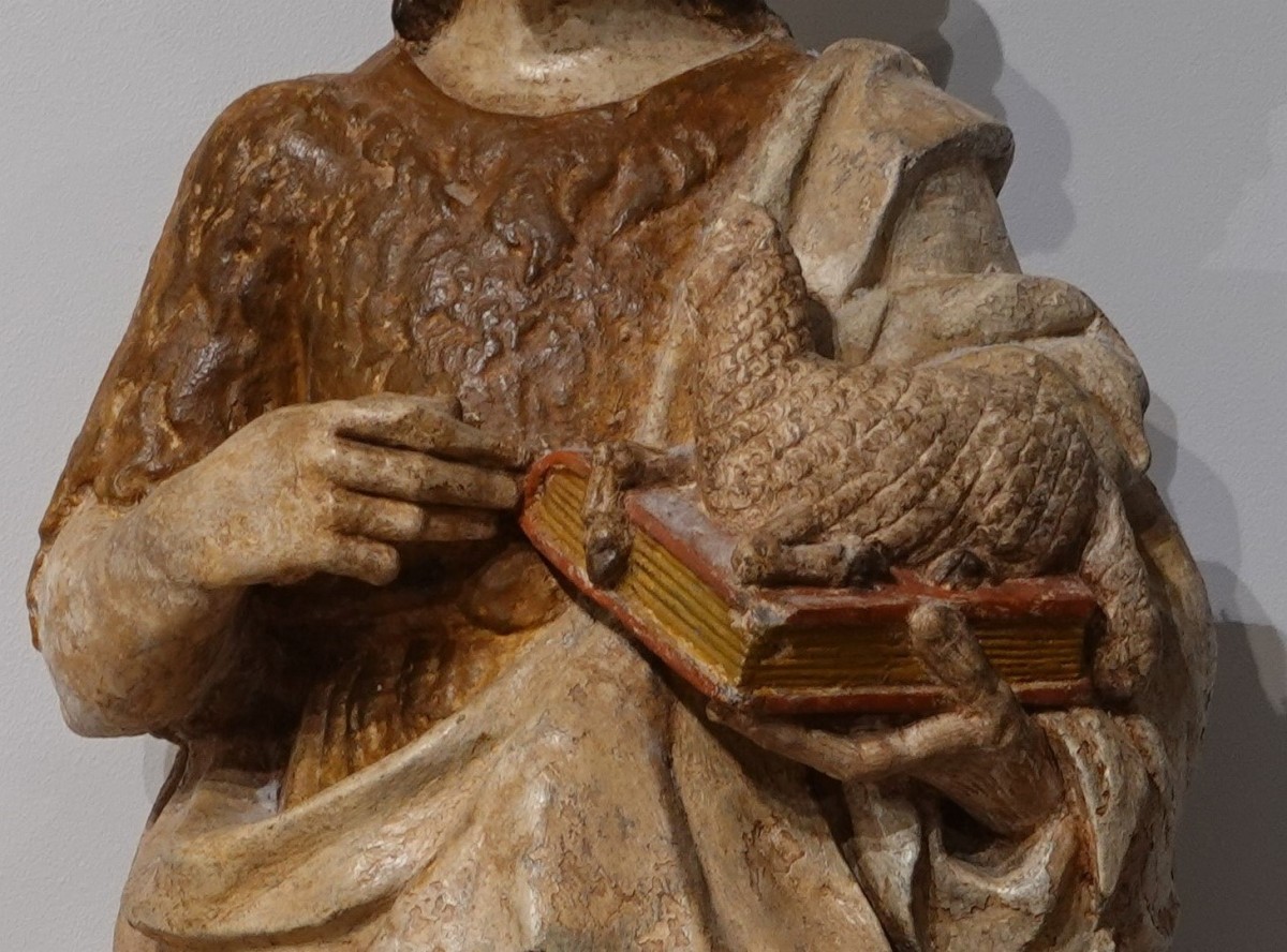 The expression is gentle on a face framed by flowing, shoulder-length hair. The folds of the garment covering the sheepskin tunic that Saint John the Baptist wears next to his skin are beautifully rendered.