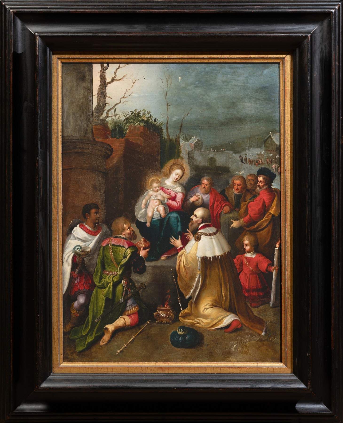 This refined work, characteristic of early 17th-century Antwerp production, brilliantly illustrates the theme of the Adoration of the Magi in a composition that is both intimate and theatrical. Executed on copper, a support prized for its smooth surface allowing for meticulous execution, the painting is distinguished by the extreme delicacy of the brushstrokes and a remarkably rich palette.