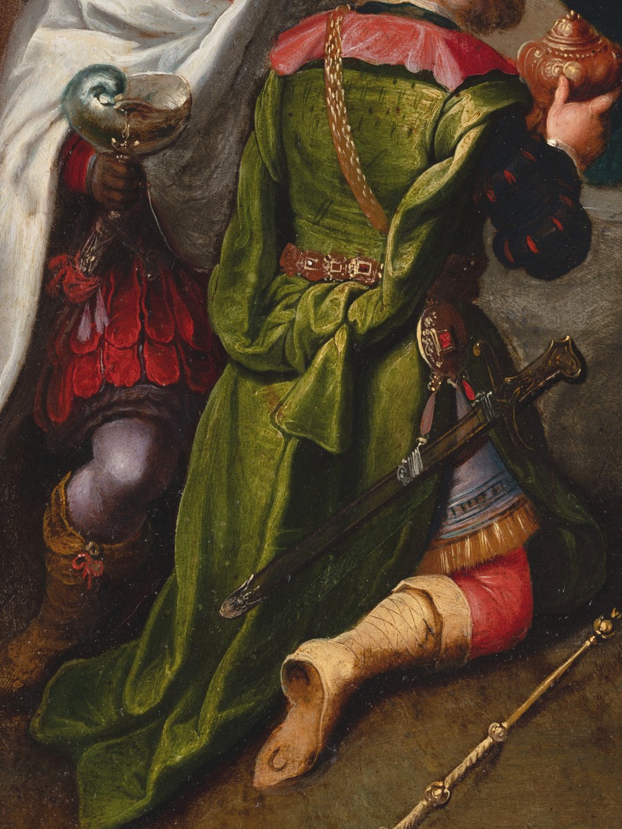 The colors, of luminous and saturated intensity—deep reds, emerald greens, shimmering yellows—lend the scene an almost jewel-like preciousness, especially since the halos are painted with gold highlights. Every detail, from the sumptuous embroidery to the metallic sheen of the gifts, is rendered with a miniaturist precision typical of Frans Francken.