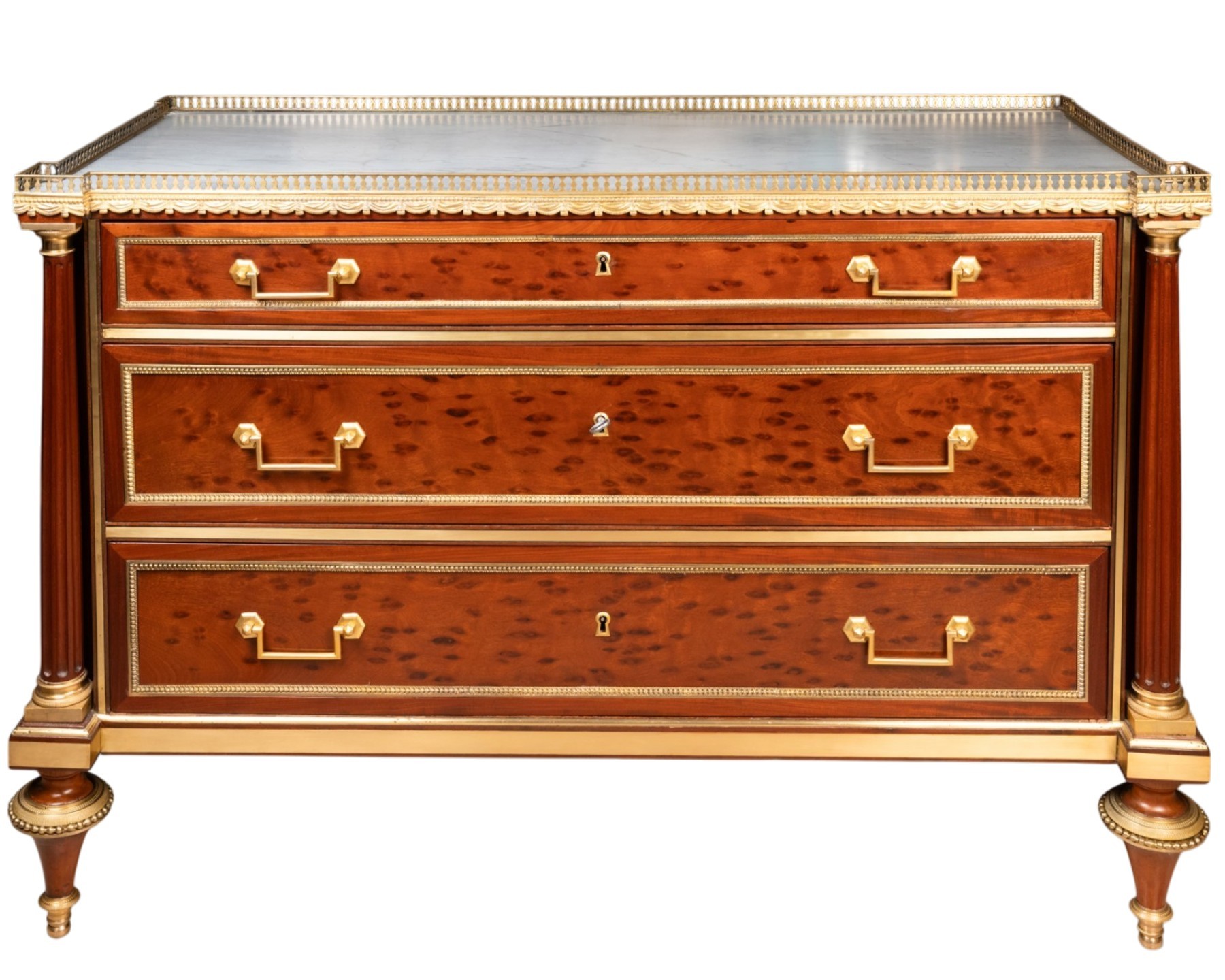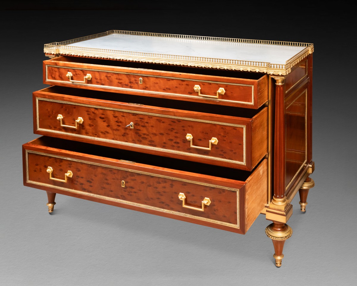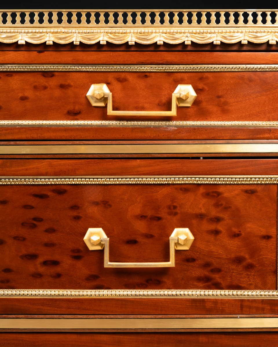 This is a three-tiered chest of drawers made of mottled mahogany, featuring two freestanding mahogany columns at the corners with gilded bronze capitals and abaci, supported by two wide spindle legs with bronze bands. Each drawer, as well as the sides, is trimmed with gilt bronze “rais de coeur” frames. The piece is topped with a slab of “Bleu Turquin” marble, bordered by a gilt bronze frieze.