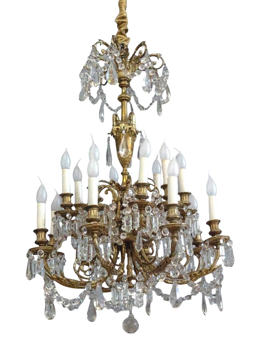 A French gilt bronze and cut crystal chandelier in the Louis XVI taste, late 19th century, with sixteen lights arranged on two tiers of eight arms around a central baluster shaft. The shaft cast with neoclassical ornament including acanthus foliage, stiff-leaf collars, fluting and a stylised urn, issuing scrolled foliate arms supporting turned candle cups and drip pans. Richly hung with cut crystal pendeloques, spear-point plaquettes, faceted button chains and graduated swags, terminating in a cut crystal ball finial. Retaining its original mercury gilding with mellow tone. Electrified for use.